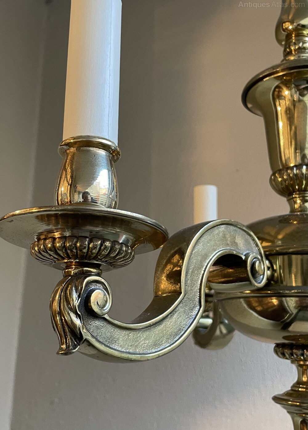 A superb quality early 20th century cast brass three branch chandelier attributed to Faraday & Son, with shaped and fluted central column and finial beneath. The three shaped arms supporting candle bulb holders.In excellent condition throughout original pleasing finish, fully rewired and PAT safety tested. A heavy chandelier. Super quality.