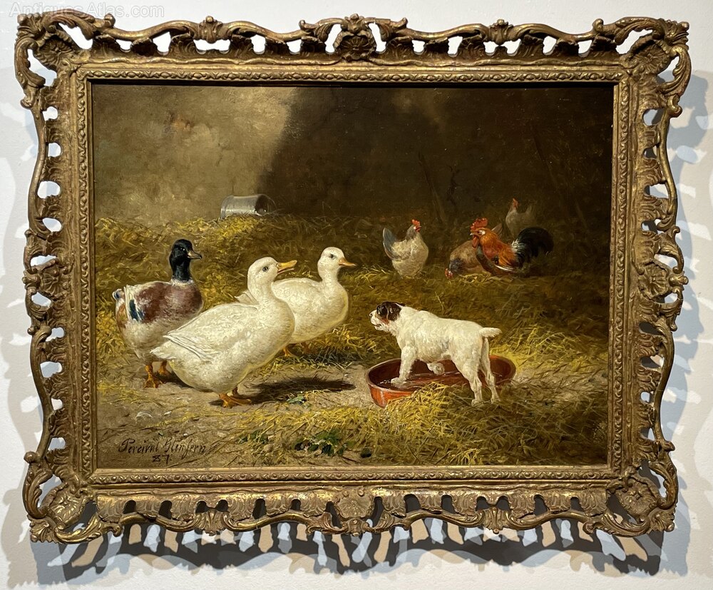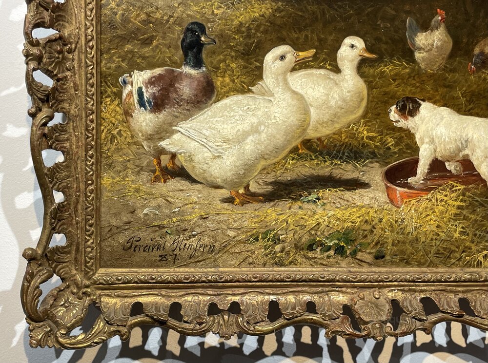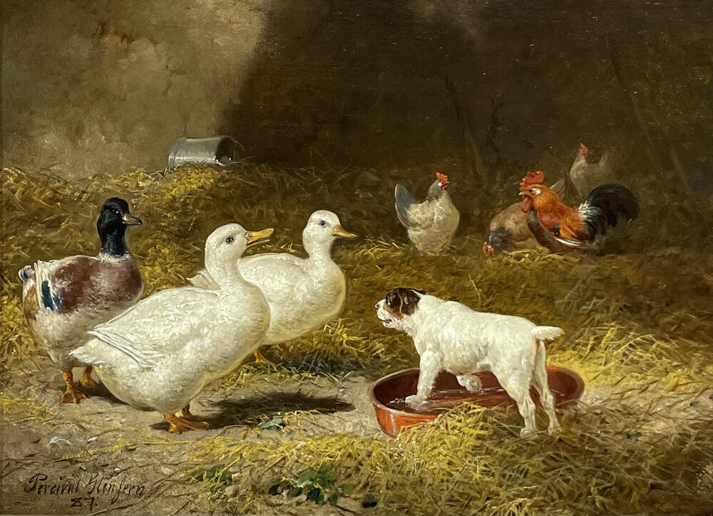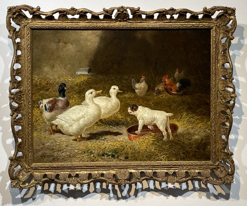 A stunning late 19th century oil painting of an amusing scene with puppy amongst the ducks. A fine oil on canvas, signed by artist Percival Glenfern and dated 1887.Offered in superb condition throughout professionally cleaned wnd conserved. Previously sold through David Messums Gallery.