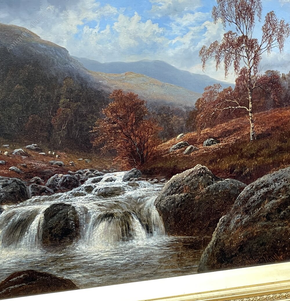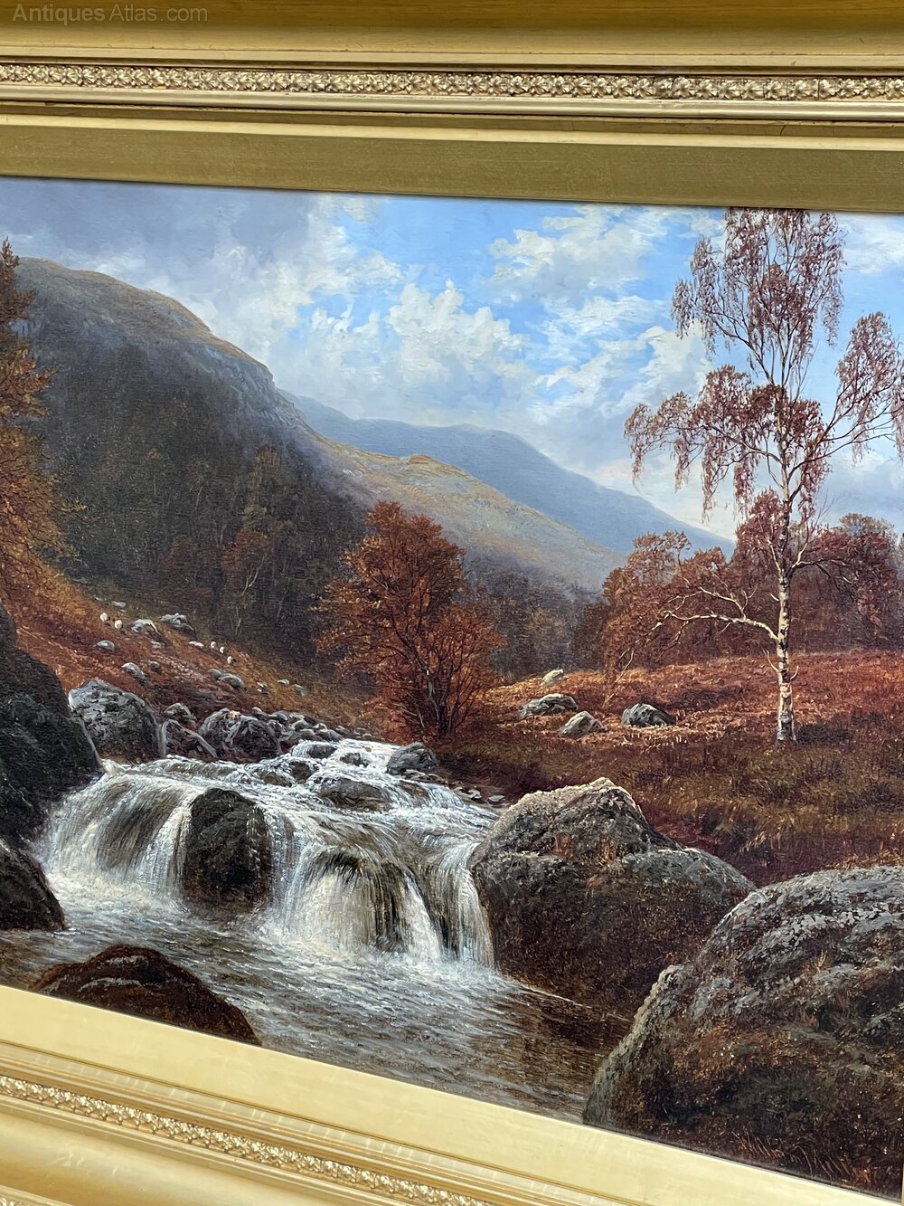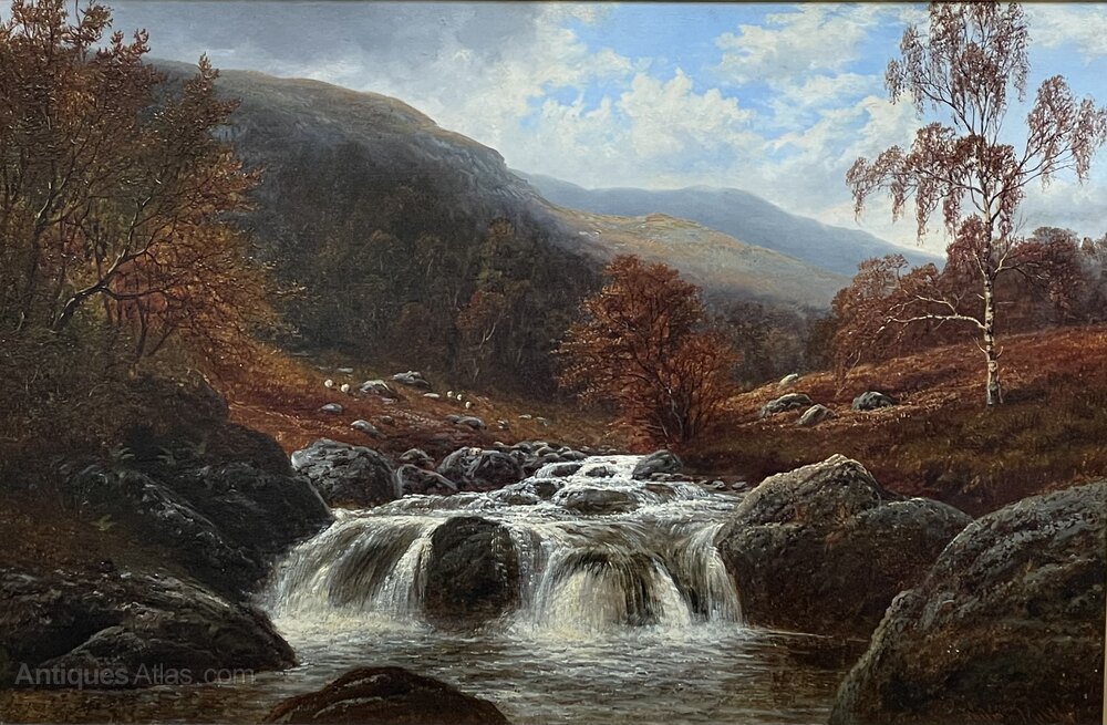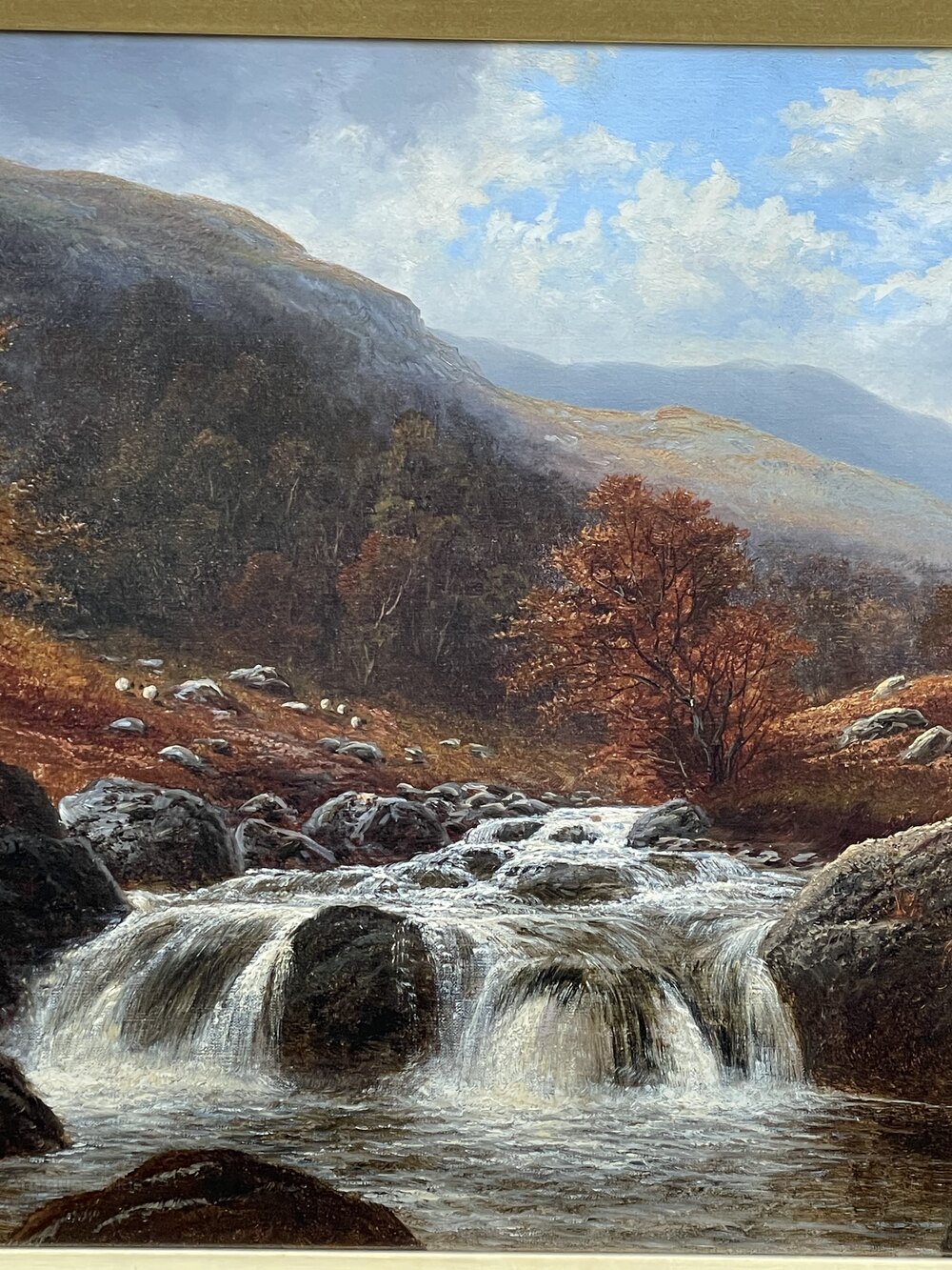A fantastic large landscape oil painting by William Mellor, British, (1851-1931). Oil on canvas, signed & further inscribed verso. Titled verso ‘on the Lugwy North Wales’.A superb example of his work, professionally cleaned and original frame restored to top showroom condition.