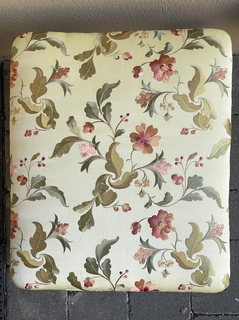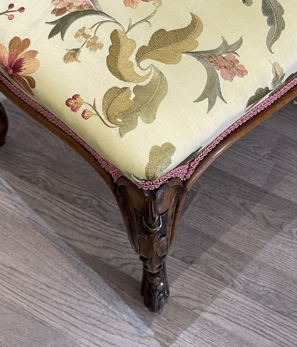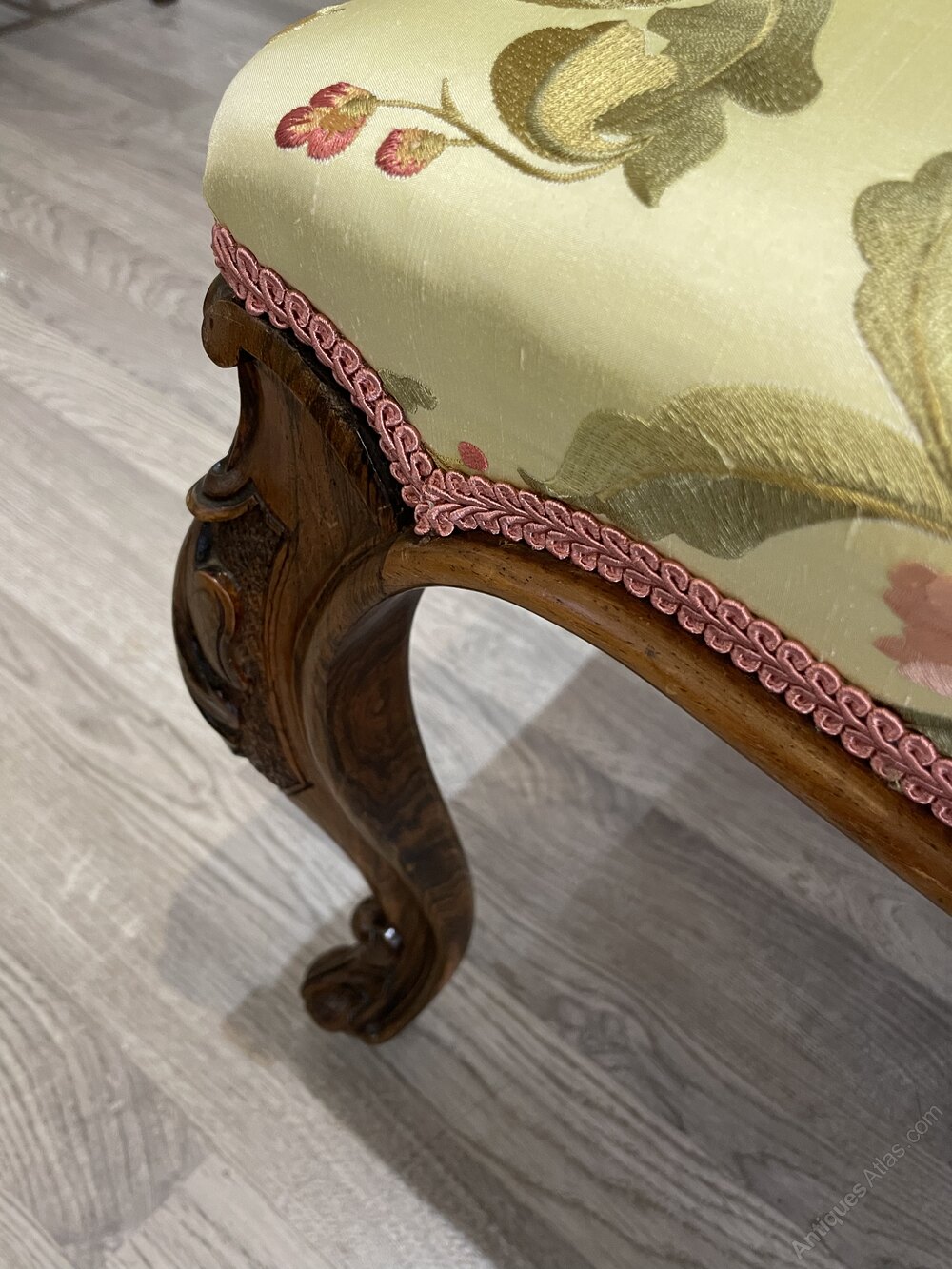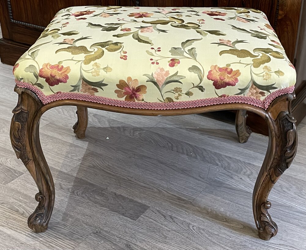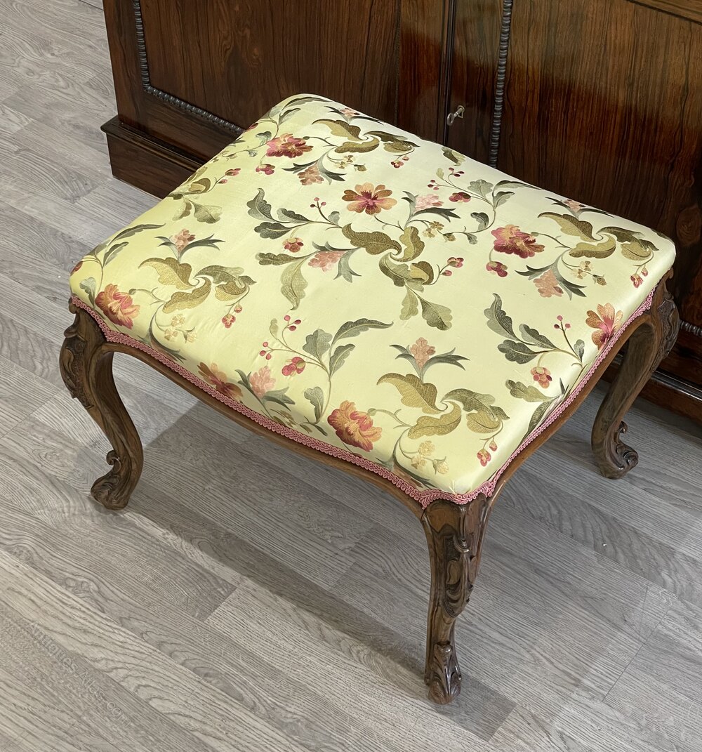 A super quality Victorian rosewood stool raised on four carved cabriole legs.A good elegant stool, having been fully reupholstered in exquisite embroidered silk.