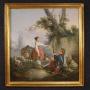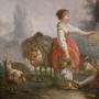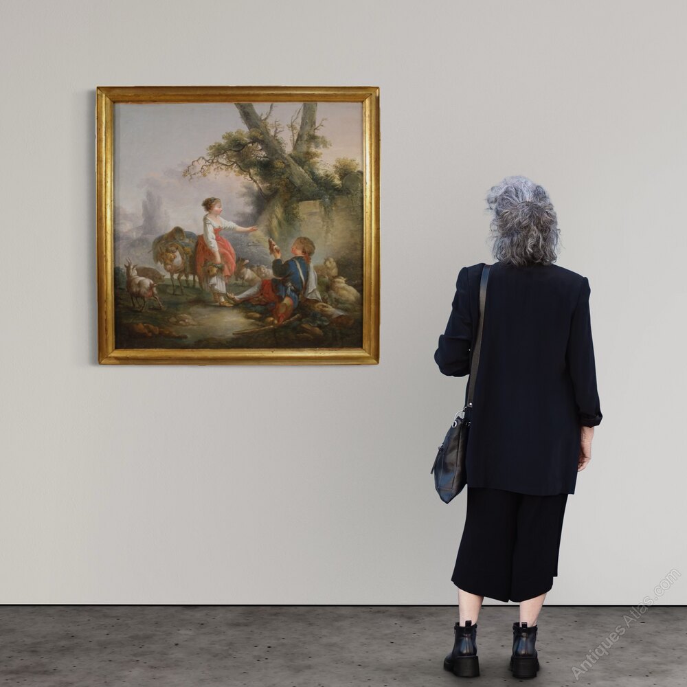 French school painting, second half of the 18th century. Oil on canvas artwork depicting a highly refined pastoral scene. In the foreground, a young shepherd rests seated next to a log, surrounded by his flock of sheep and goats. In the center, a young girl approaches him with a wicker basket filled with herbs, offering him her left hand. Behind her, a splendid mule carries tools.Pastoral scenes are a pictorial genre that spread throughout Europe and reached its peak during the Rococo period in France. Stylistically, given the subject matter, pictorial quality, and setting, this artwork can be traced back to the circle of Jean-Baptiste Huet (1745-1811). A highly talented artist specializing in pastoral scenes, he was influenced by Francois Boucher. (The painting is not currently accompanied by an expert opinion, but one can be requested upon payment of the relevant additional costs.)