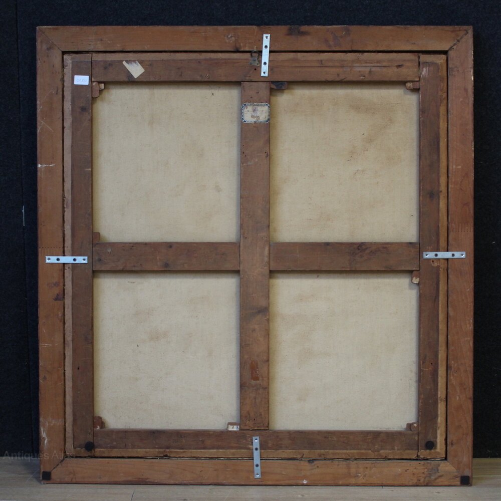 The pleasing subject matter and the color palette, which plays on light and bright tones, lend great decorativeness to the painting, making it easily adaptable and suitable for display in a variety of settings. The 20th-century carved and gilded wooden frame shows some signs of aging. The painting has already been restored with re-lining, replacement of the stretcher, and repainting in small areas. Overall, it is in good condition. Interior dimensions: H 94 x W 88.5 cm.