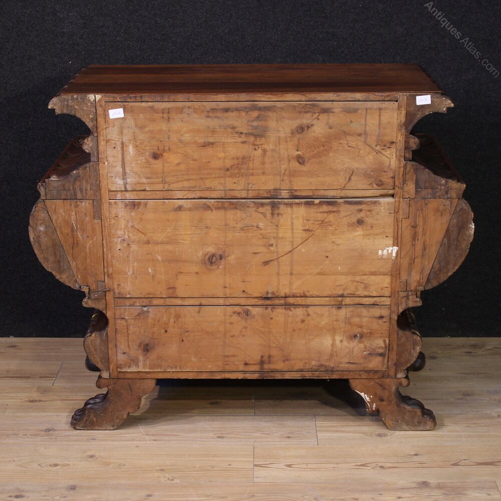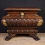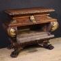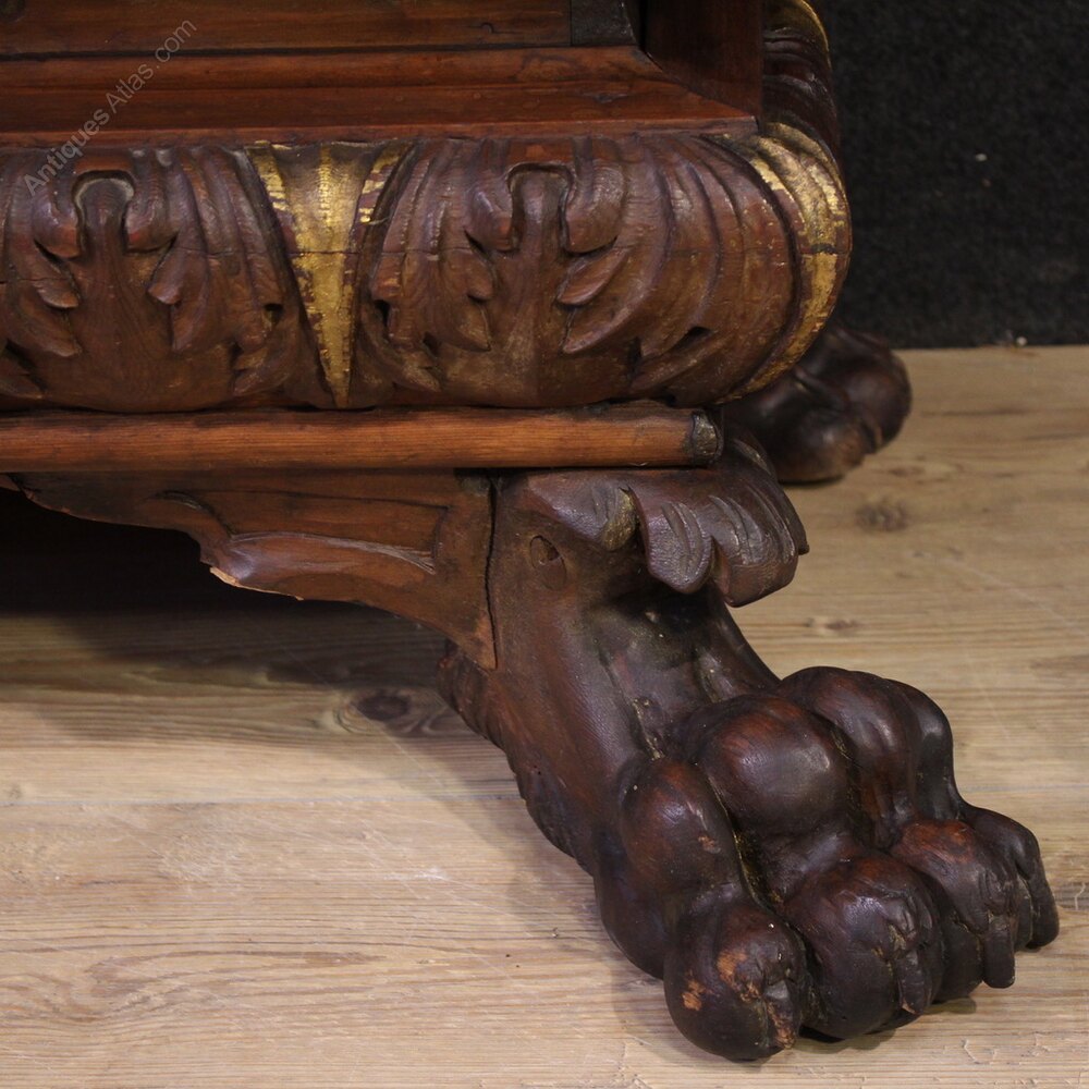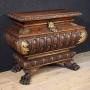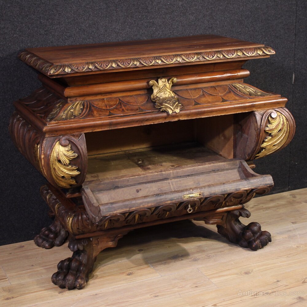 Tuscan urn-shaped chest from the first half of the 20th century. A curved furniture finely carved from walnut, adorned with gilded highlights and a noble coat of arms, of exceptional quality. The chest features a front drop-leaf (see photo) offering a generously sized compartment, complete with a working key. The wooden top is ideal for displaying important sculptures or large ceramic vases. The usable surface measures 46.5 x 90.5 cm.The chest is supported by four large, solid carved lion's paws. This chest has a fabulous design, ideal for a large living room or study, or for antique dealers and interior decorators. The drop-leaf lock was replaced during restoration in the 20th century. It has a beautiful patina and is in good condition.