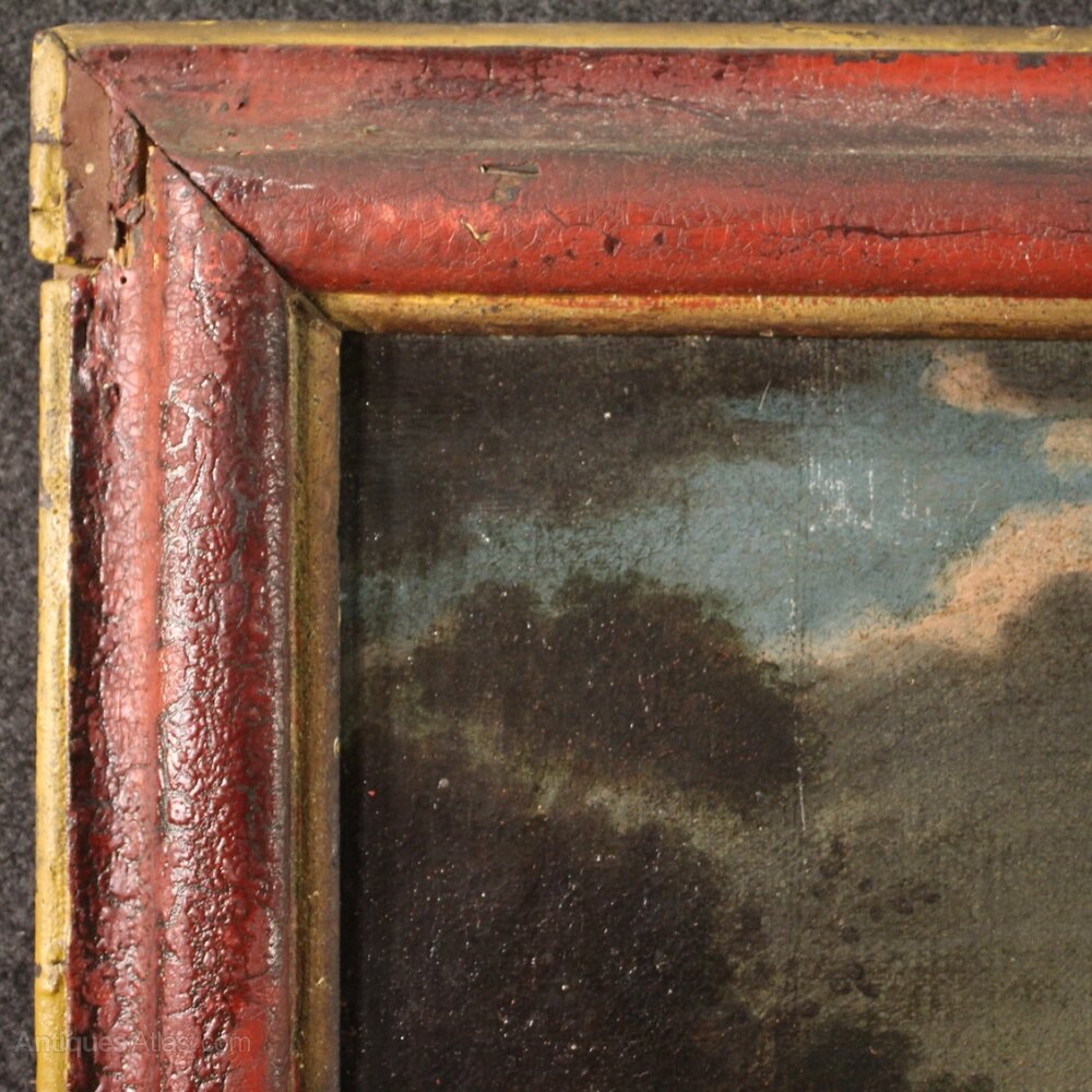 Antique Italian painting from the 17th century. Artwork oil on canvas depicting a religious subject, Jesus stripped of his clothes, scene of the passion of Christ of good pictorial quality. Large-sized and beautifully decorated artwork, rich in characters and decorative elements, for antique dealers, interior decorators and collectors of ancient sacred art.Antique wooden frame not coeval adapted to the painting, sculpted, lacquered and gilded (lacquering and gilding of the twentieth century). Painting that has undergone an intense conservative restoration, relining, replacement of the frame and color recovery in various points (see photo).