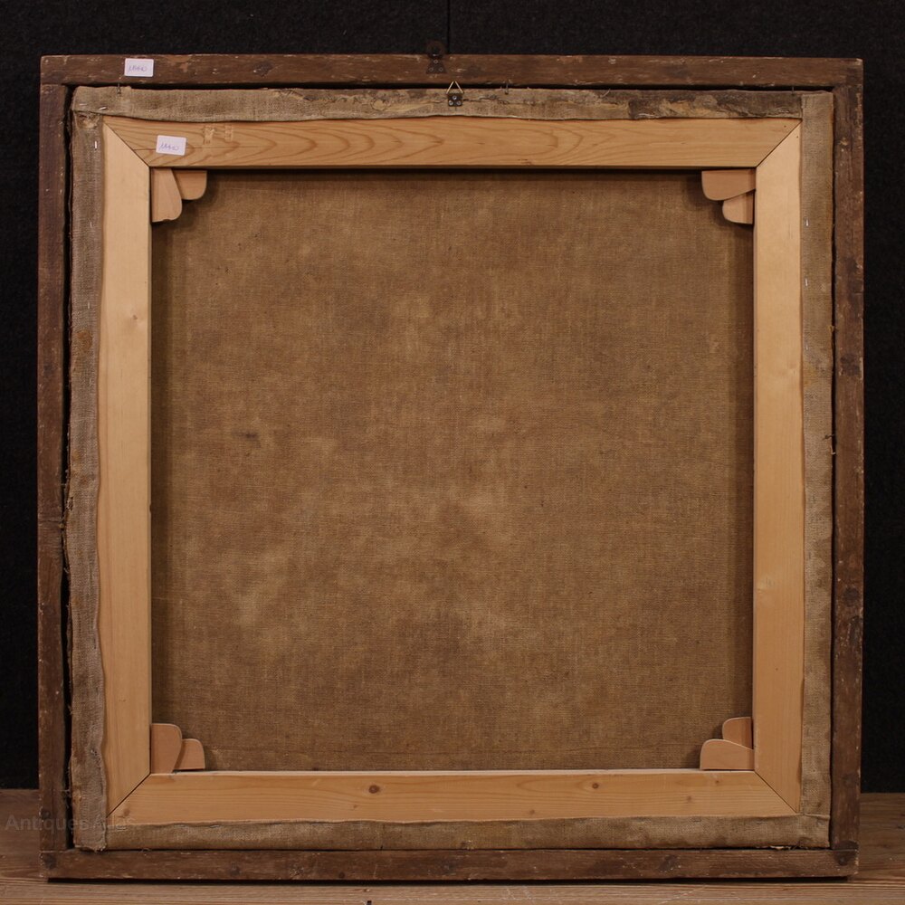 A painting of ideal size, perfect for a prestigious setting, whether classic or contemporary. A Homeric page translated into painting with rare intensity, a refined work for a collector of mythological paintings. The 20th-century frame is in carved and lacquered wood, with various signs of aging. The painting has already been restored with re-lining, replacement of the stretcher, and restoration of the color in small spots. Overall, it is in good condition. Internal dimensions: H 89.5 x W 89.5 cm.