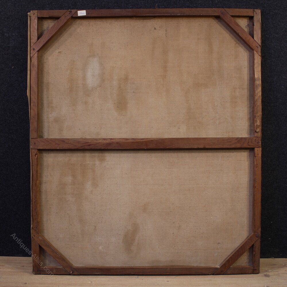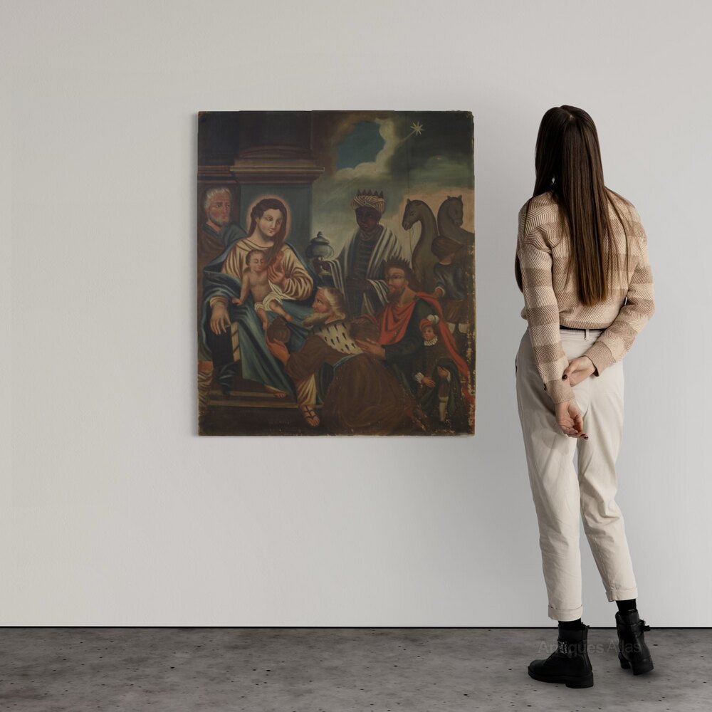 Spanish painting from the second half of the 19th century. Oil on canvas, first canvas, artwork depicting a religious subject, the Adoration of the Magi, with a decent level of pictorial quality. A beautifully sized and impactful painting, almost square in shape, with a pleasant décor. The composition, characterized by soft colors, features Joseph and the Madonna and Child on the left, welcoming the Three Kings accompanied by pages and camels. A rustic painting for antique dealers and collectors of religious art. The canvas shows some signs of aging and several paint losses, requiring restoration. The painting has a patina and is in fair condition.As each of our products will be accompanied by a certificate of authenticity and warranty and photographic documentation. Every item will be packed in a custom-made wooden box. Free shipping in Europe and UK (import and custom duties NOT included). Worldwide shipping at affordable prices, ask us a shipping quote. BUY IN INSTALLMENTS INTEREST FREE.