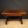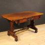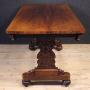 Antique Welsh writing desk from the mid-19th century. This high-quality furniture is finely carved and veneered in mahogany, palisander, and fruitwood. The desk is finished for the center and features two spacious drawers and a generously sized wooden top, making it ideal for professional use. The table rests on four carved legs with floral decorations, fitted with metal casters for easy movement.Under one drawer, there is still a label indicating the desk's production, referring to Isaac Davies's Manufactory on King Street in Carmarthen, a well-known Welsh company founded around 1821. The furniture has undergone some restoration work over time (see photo). Structurally sound and solid, the desk shows some signs of wear, but is in overall good condition.