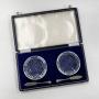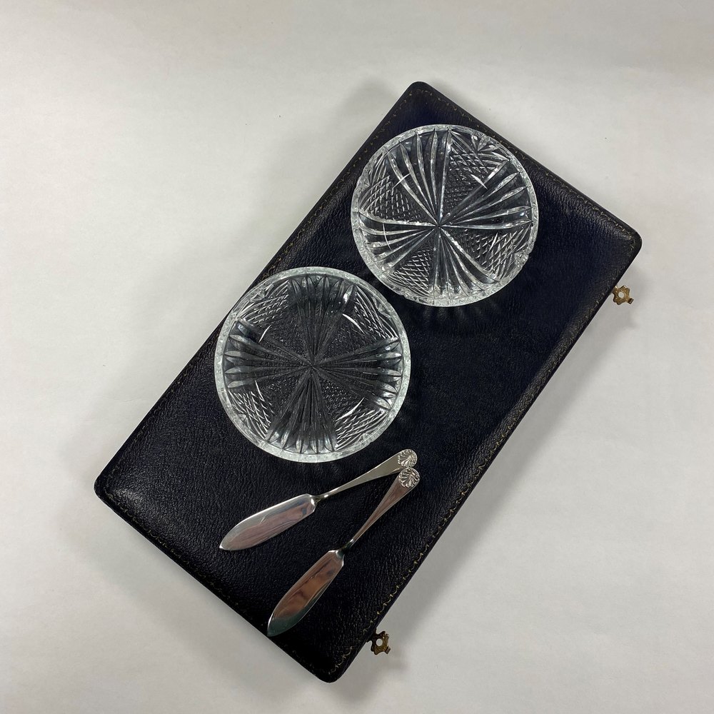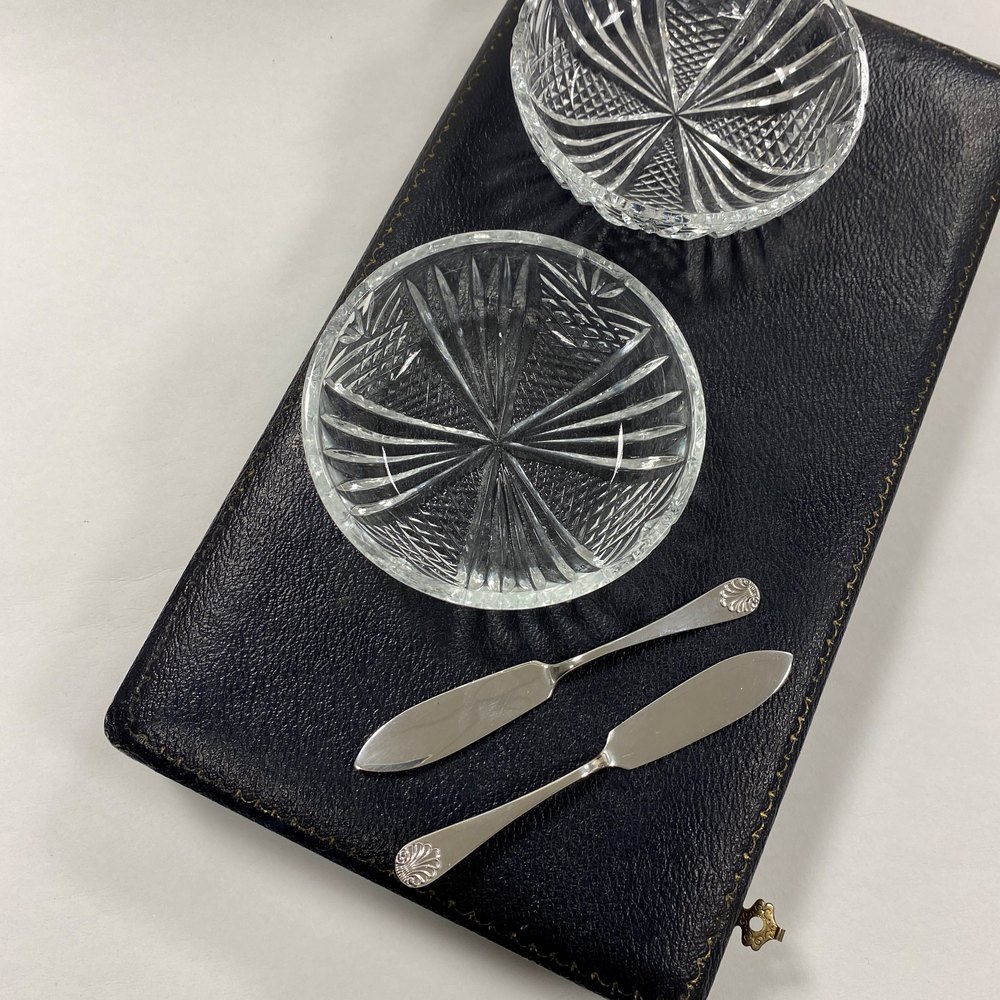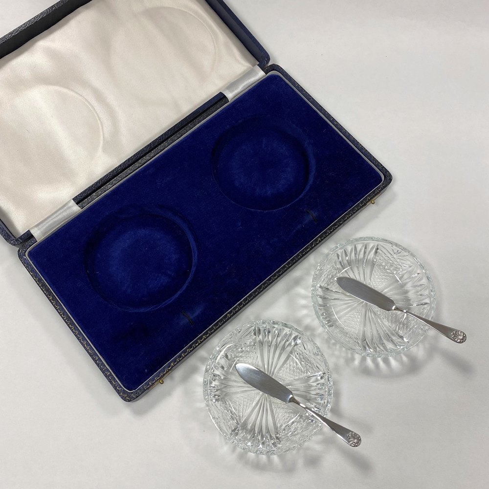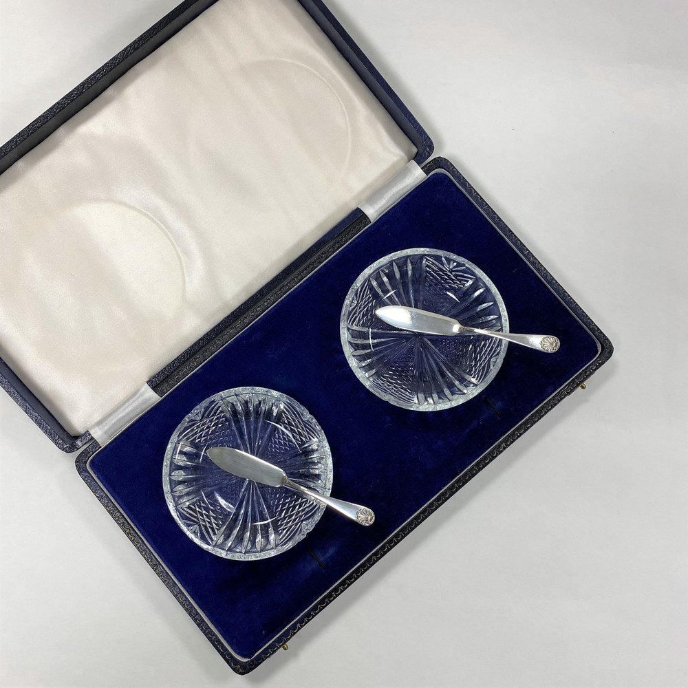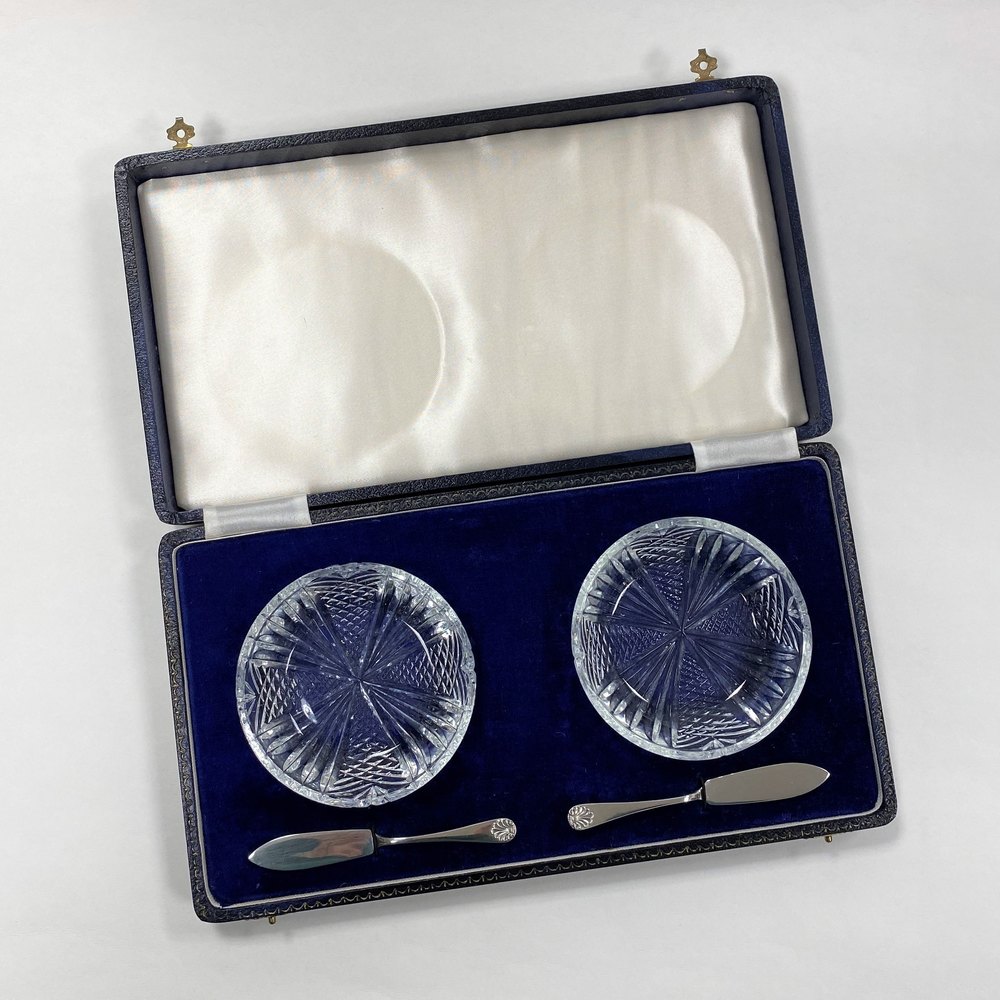 This super glass butter dish and silver knife set comes in its original fitted box. The dishes are cut glass with hallmarked solid silver knives. Made by J. B. Chatterley & Sons, the silver has the Birmingham hallmark with the date 1975.The condition is very good with no chips or damage to the glass or silver. The presentation box is original with some slight wear. This lovely set would make a perfect gift.