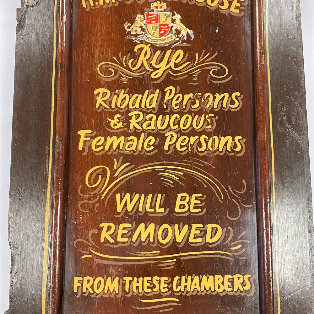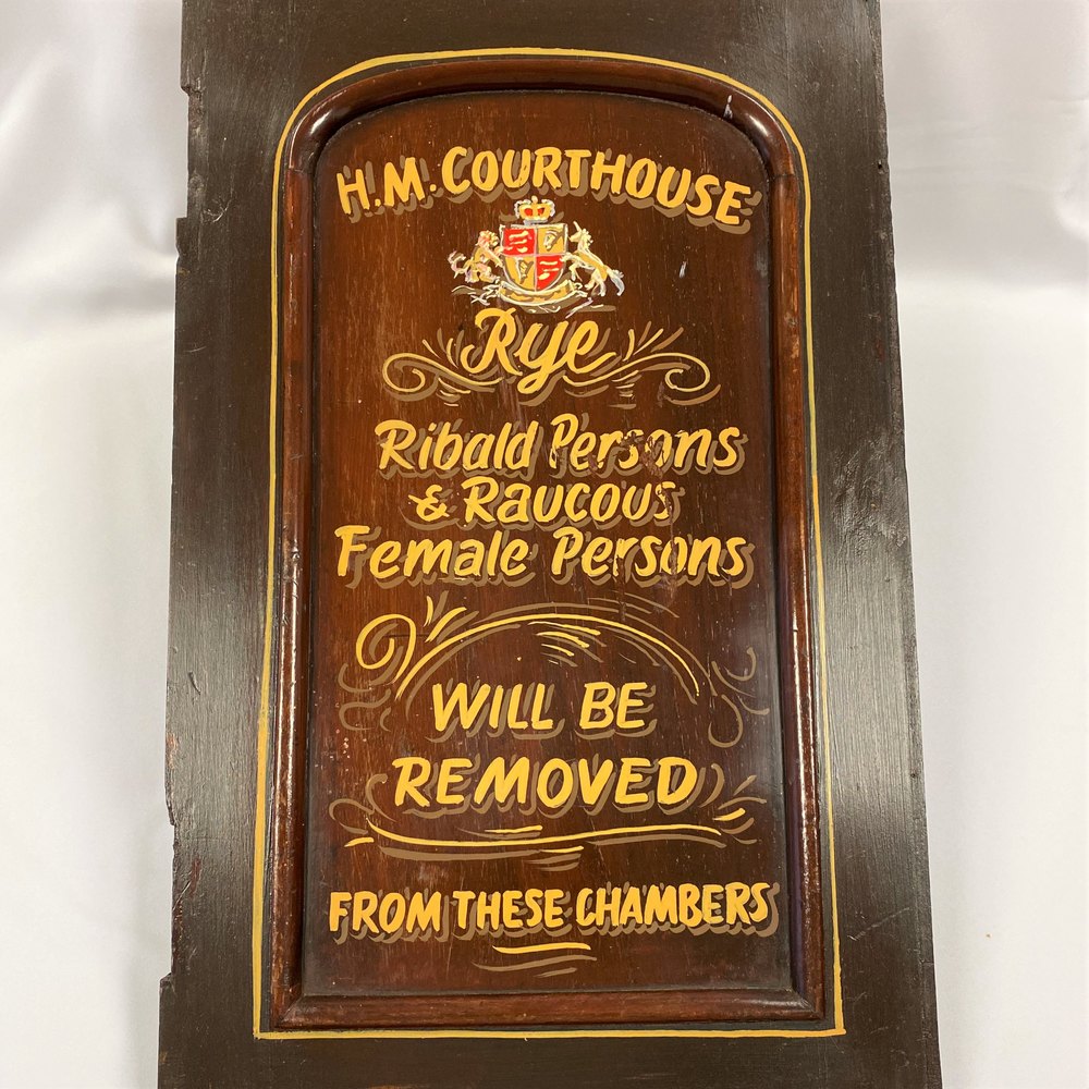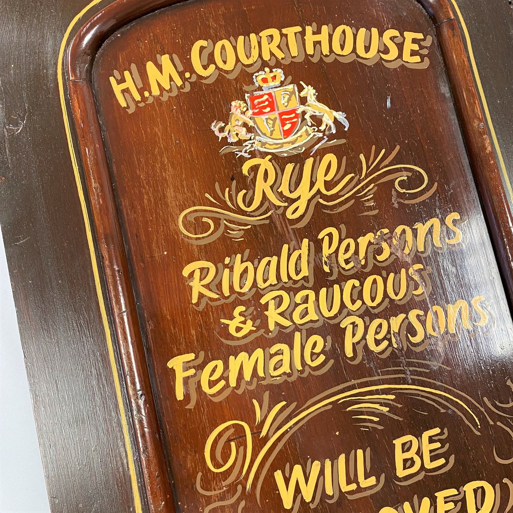 A great piece of social history! Painted on an old wooden door panel, this rare sign has great content with lovely naive signwriting.The inscription reads... 'H.M. Courthouse, Rye, Ribald Persons & Raucous Female Persons Will Be Removed from These Chambers'.