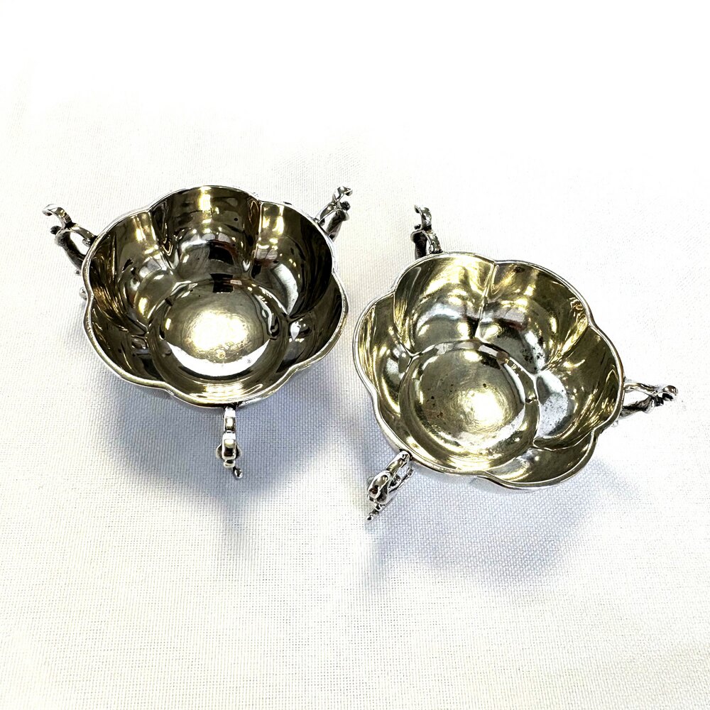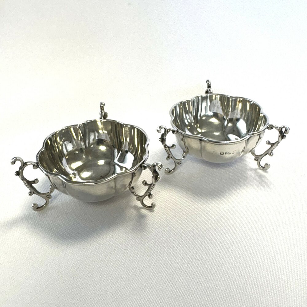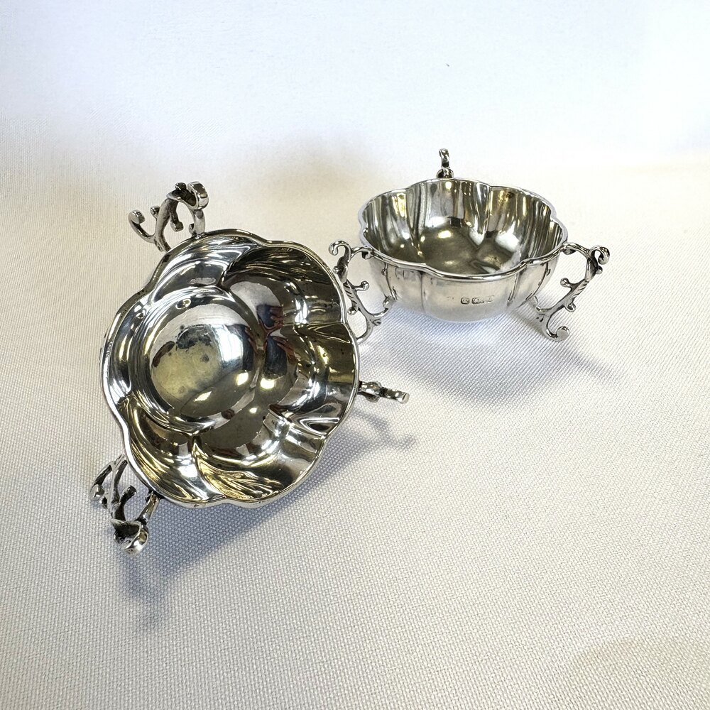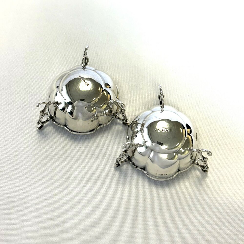 An elegant pair of Edwardian Silver Salts with tripod supports. Hallmarked for Birmingham 1910/1911, both with the makers initials J.D/W.D within a shield (John & William F. Deakin). Both are stamped H8058 to the underside of their bases.This quality pair of antique salts would make a great addition to any silver collection, display or for table use.
