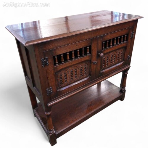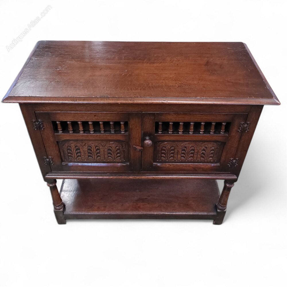A fabulous English aged oak small food hutch made in the period style. Made in the mid 20th century in a design from the 17th century. Solid oak throughout and with a wonderful colour and patina. One shelf inside which splits into two pieces. Superb condition. 36" wide x 18" deep x 33" high.UK MAINLAND DELIVERY INCLUDED PRICE.