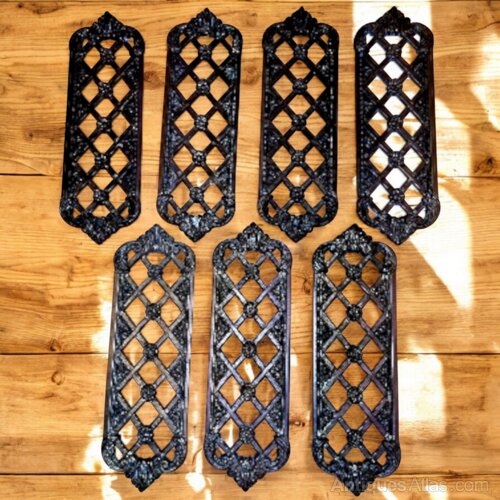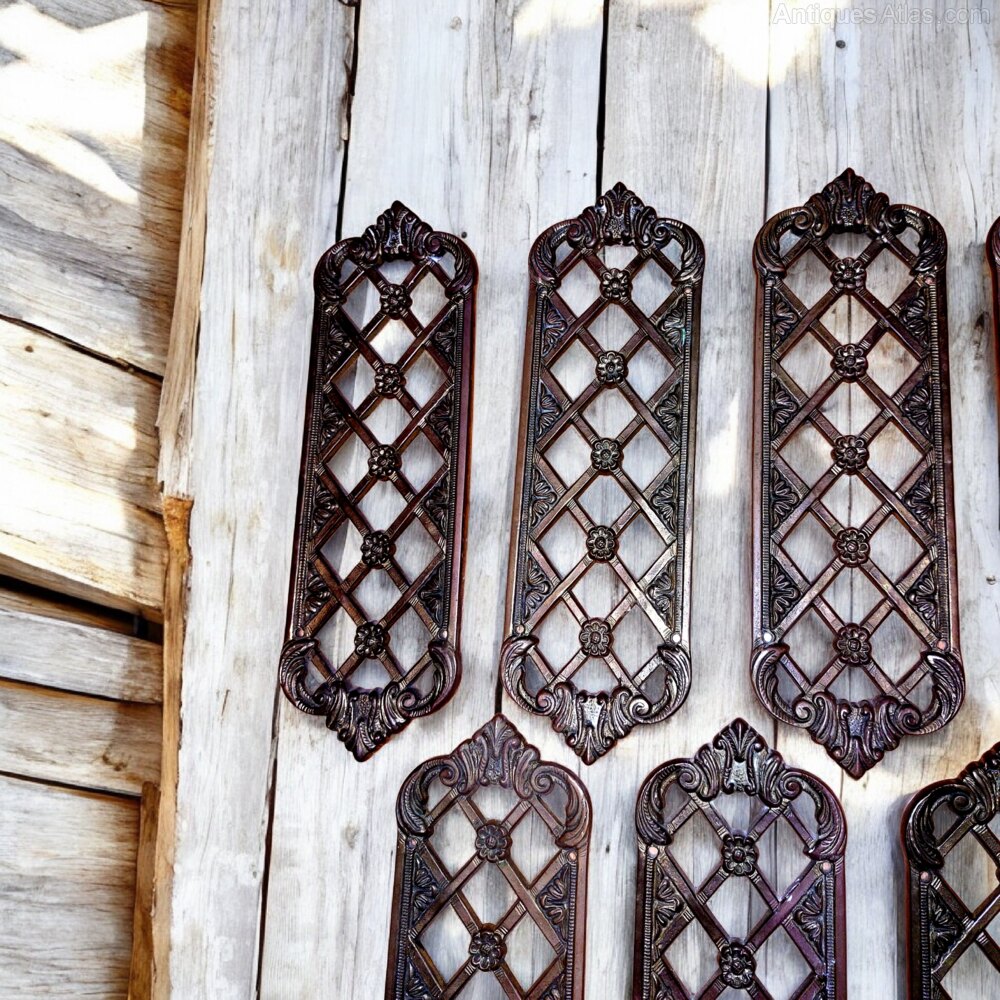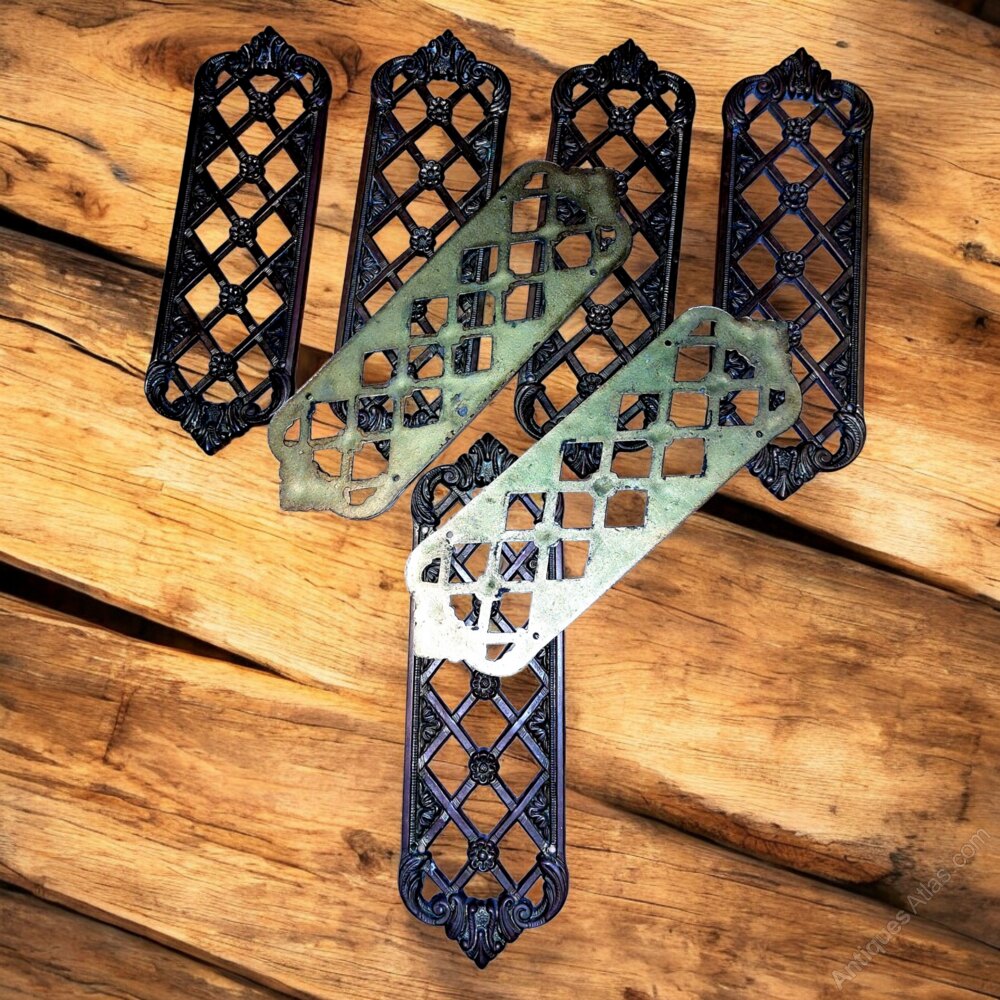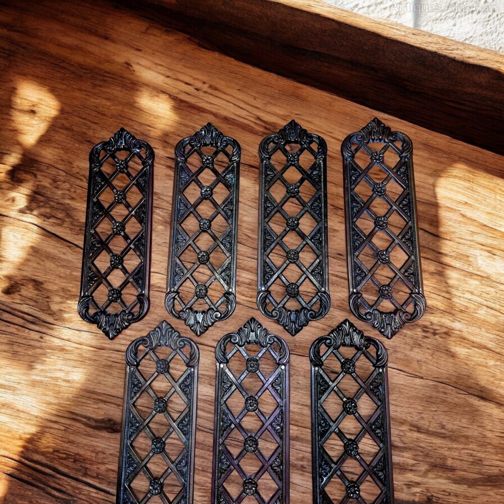 A set of seven very fine cast brass Victorian pierced door finger plates. Very finely cast and in the original unpolished finish. Very good condition. 9 1/4" tall x 2 7/8" wide x 3/16" deep.UK MAINLAND DELIVERY TRACKED AND INSURED INCLUDED IN PRICE.