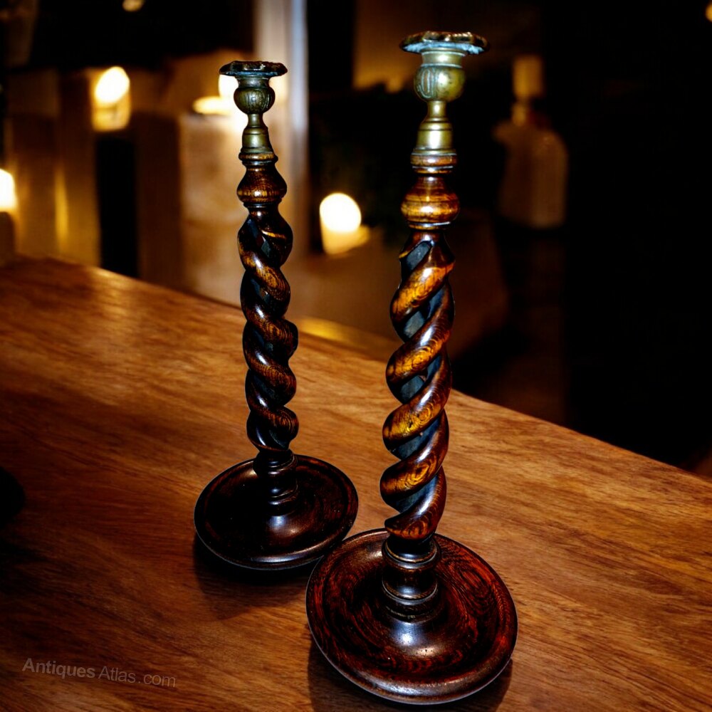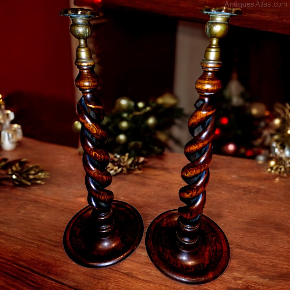 A superb and best quality English pair of open twist oak candlesticks dating to the early 1900s. Standing an impressive 18 1/4" tall and standing on 7 1/4" diameter dished bases. Tapered stems rising to cast brass tops. Will take a 3/4" diameter candle. No restoration or damage to this fine pair of rare candlesticks. Original deep polish and patina to the wood and brass.UK MAINLAND DELIVERY TRACKED AND INSURED INCLUDED IN PRICE.