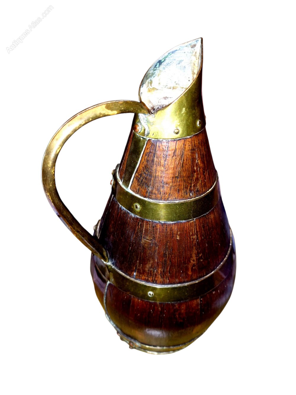 A lovely English Oak Antique coopered cider jug with brass bands and handle secured with brass and copper rivets. Lovely patina and colour to the oak and brass. Circa 1880. 10 5/8" tall x 5" wide at the bulbous bit. 6" wide to handle.UK MAINLAND DELIVERY TRACKED AND INSURED INCLUDED IN PRICE.