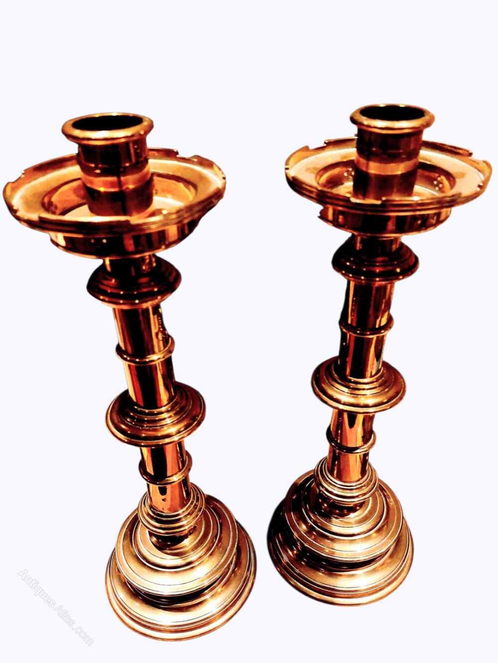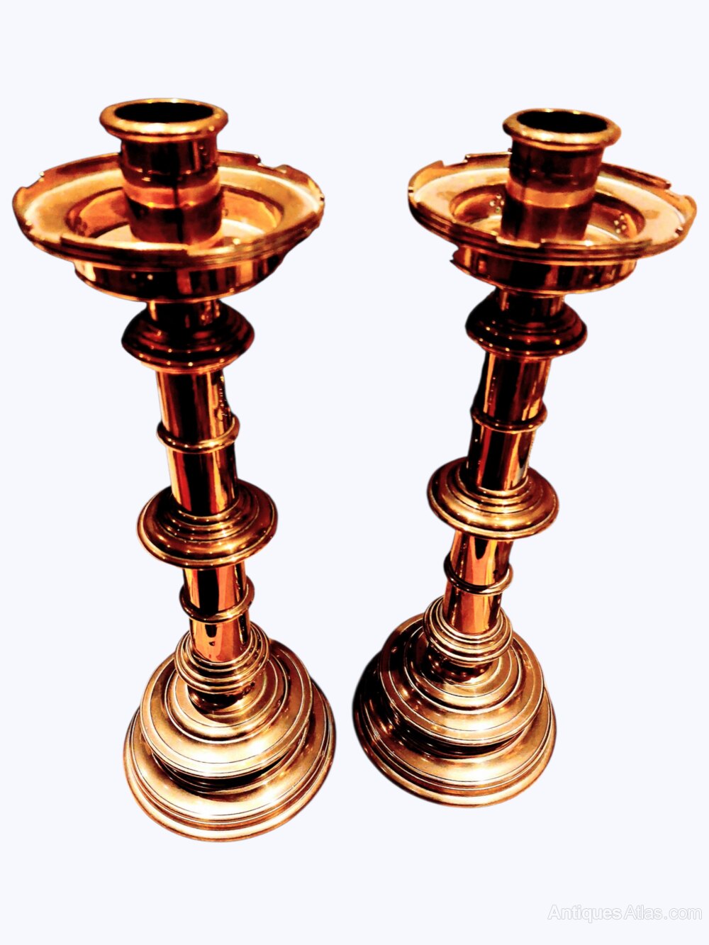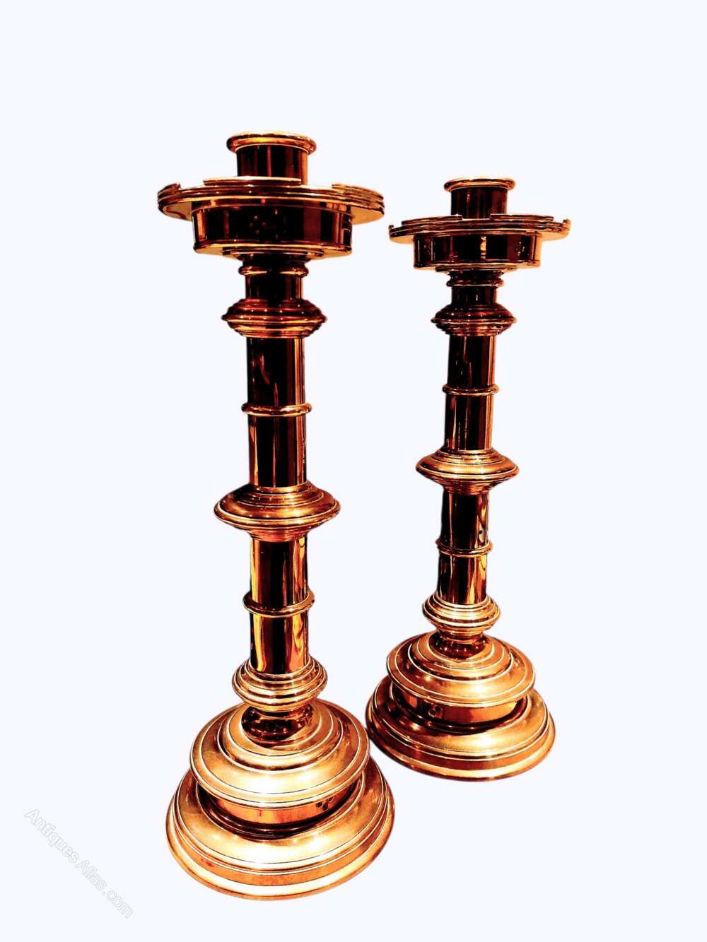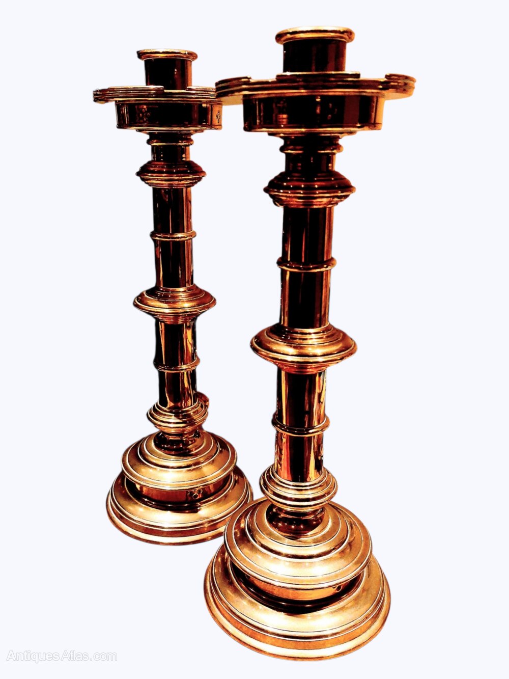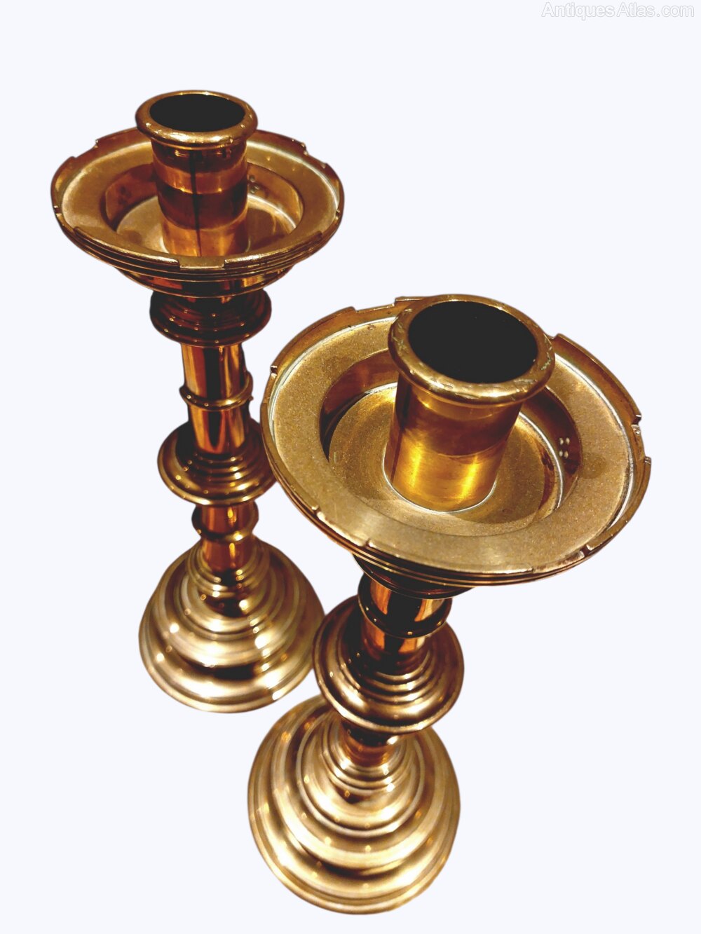 Pair Antique Castellated Top Gothic Candlesticks