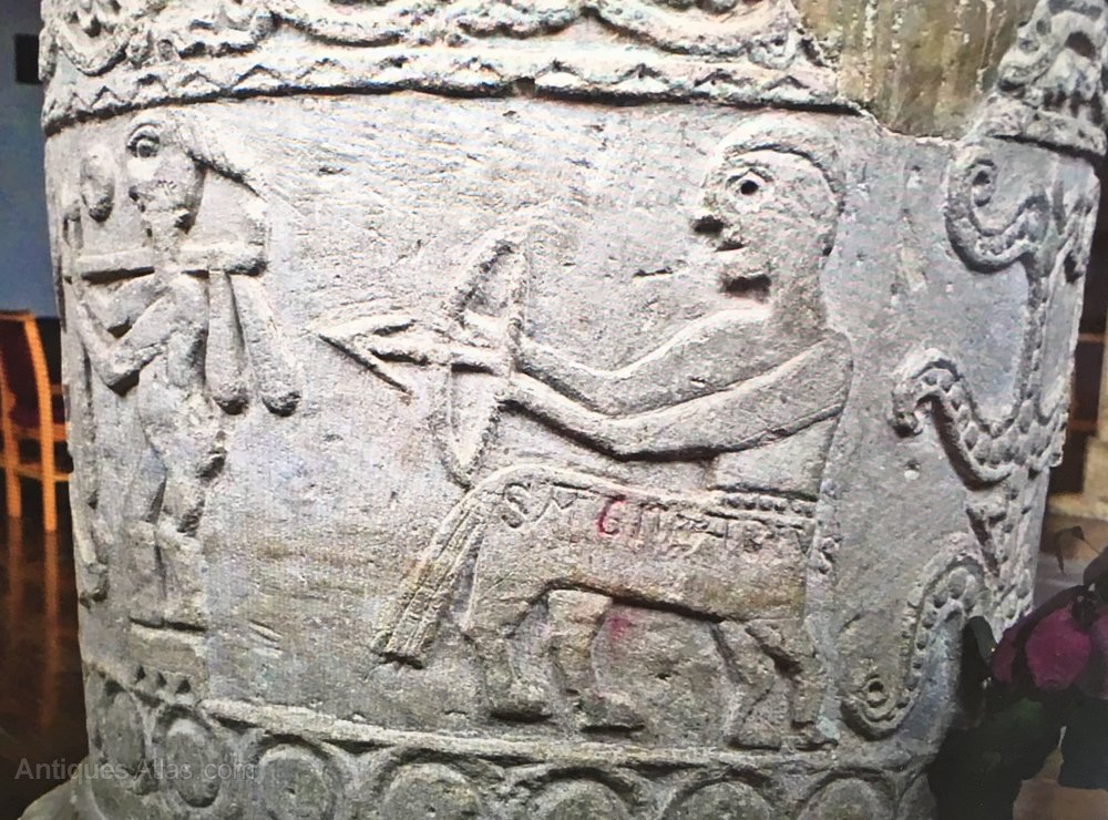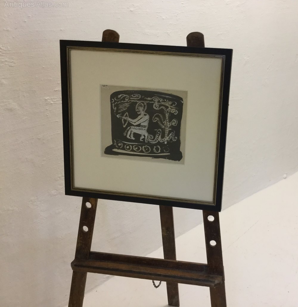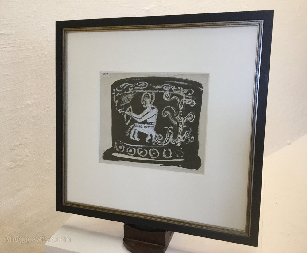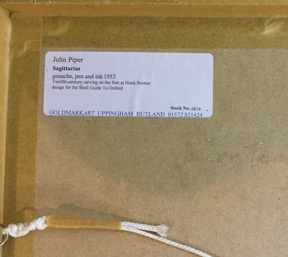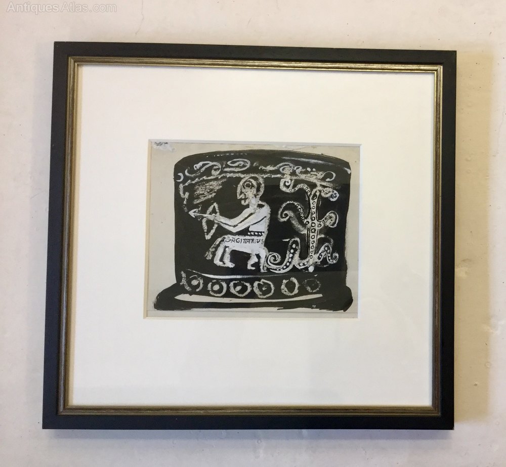 An Original John Piper Gouache, Pen And Ink.Sagittarius A Twelth Century Carving On The Font At St Peter' Church, Hook Norton, Banbury, Oxfordshire.