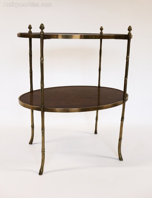 French Brass & Burr Walnut 2 tier Etagere, circa 1920sOval tops with Burr Walnut Veneer,