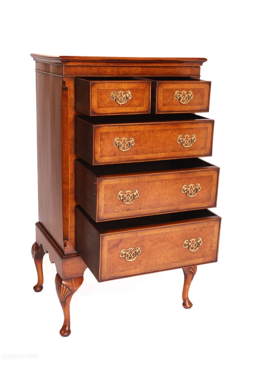 Queen Anne style Burr Walnut 5 Drawer Chest circa 1930sPlain Walnut top,