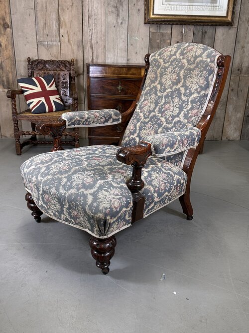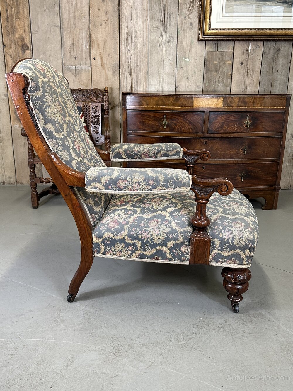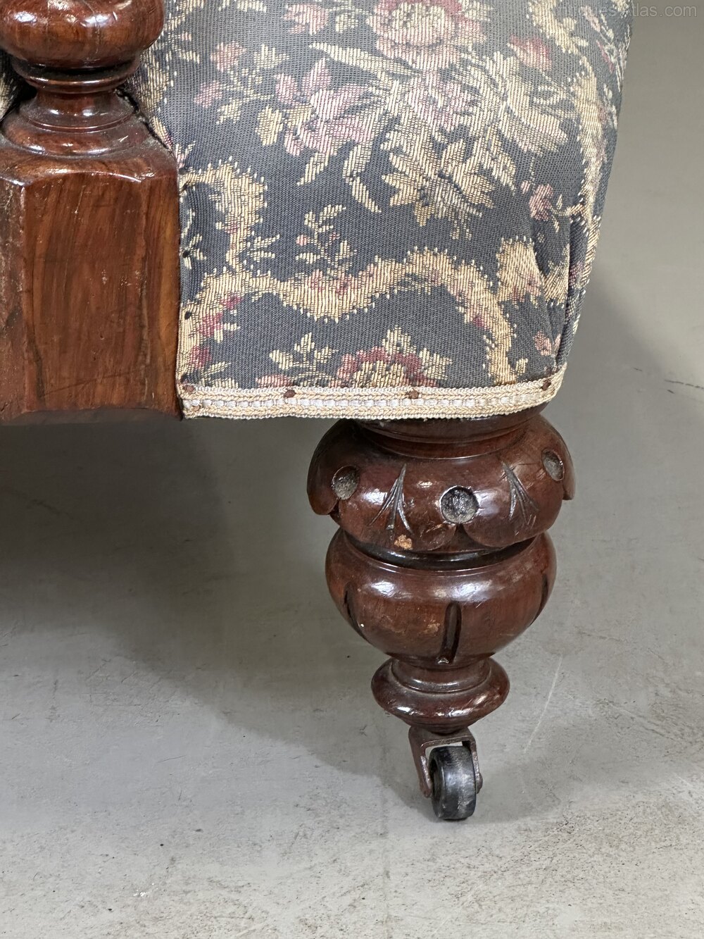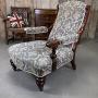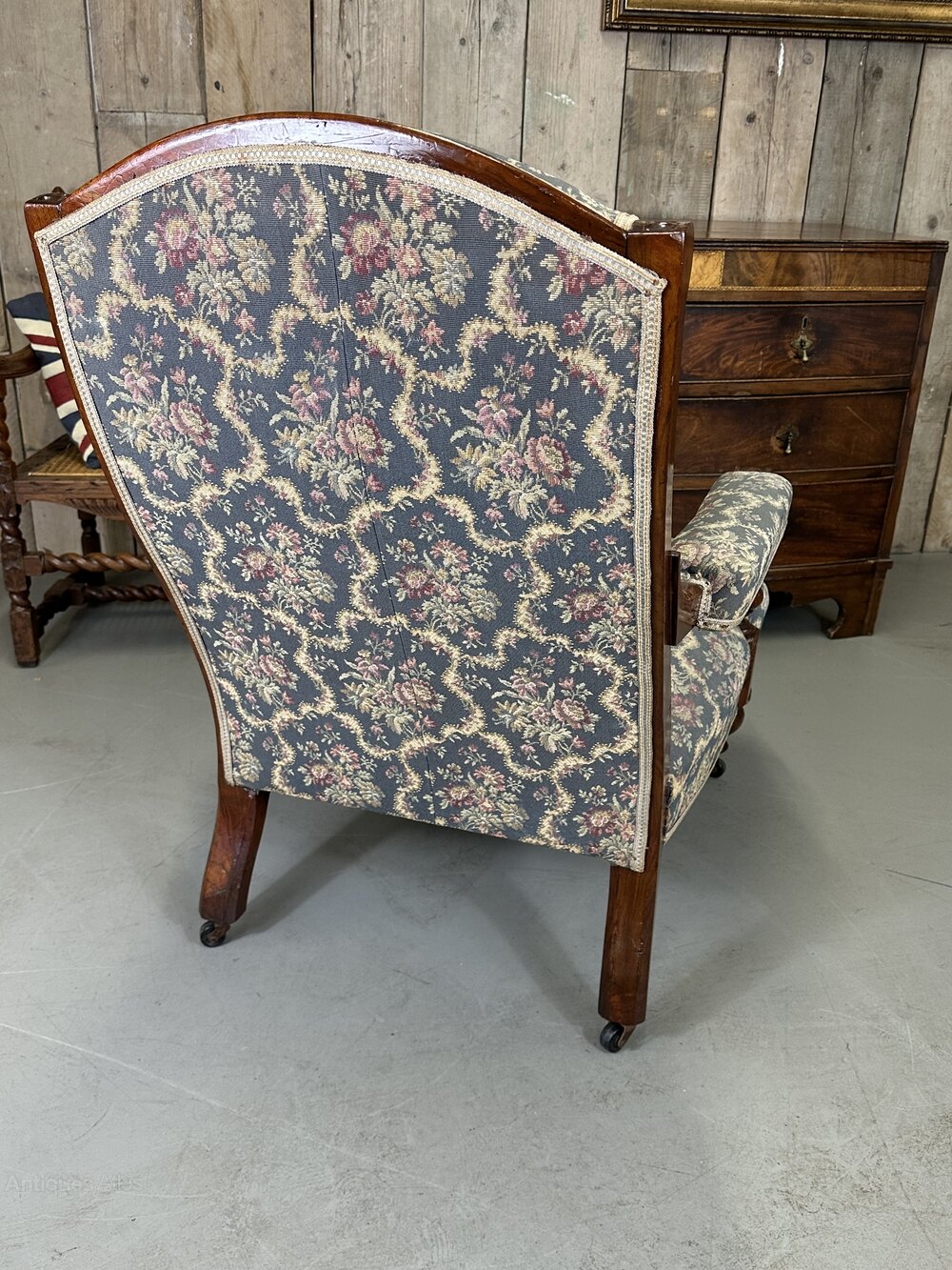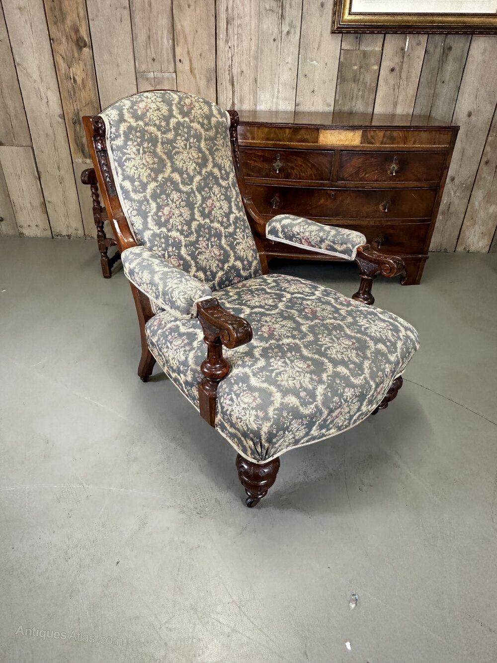 A superb Victorian carved Walnut Library Armchair that has been recently recovered beautifully with a floral grey fabric on overstuffed back support, arm and seat.The frame has fabulous carved flowerbells all sitting on turned front legs with castors and rear splayed legs.