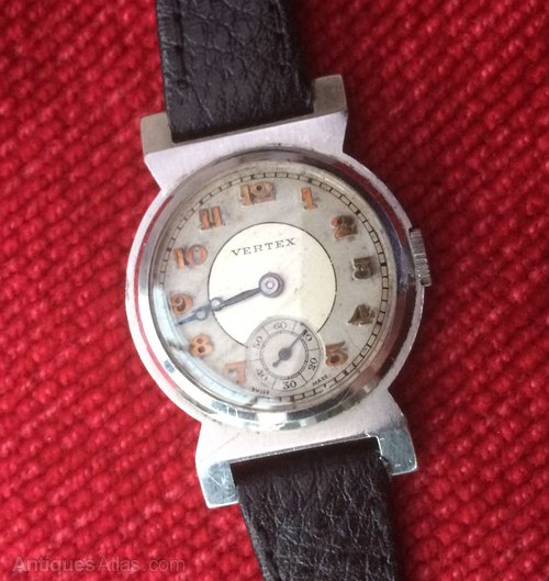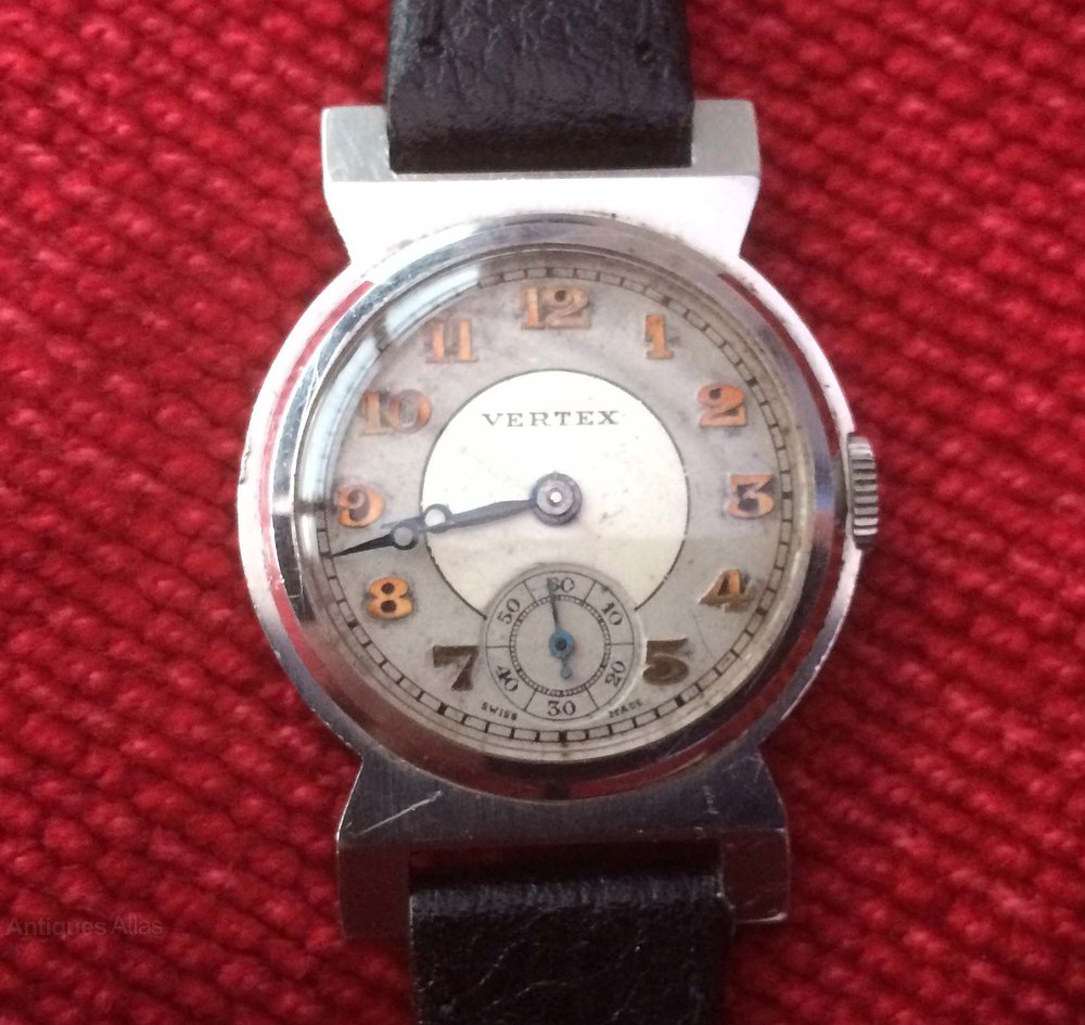 We have for sale a small gentleman's 1930s art deco Vertex watchThis unusual art deco design Vertex watch has a round stainless steel case extending to flared lugs giving the watch a bow shaped appearance. The case does carry some surface scratches commensurate with its age. The striking two tone silvered dial consists of an outer railroad minute chapter and an inner hour chapter marked in gold Arabic numerals. The dial is signed Vertex, Swiss Made and is completed by the original blued steel hour and minute hands and the subsidiary second dial. The dial is lightly aged and the hour, minute and second hands are all in an excellent condition. The dial is encapsulated beneath a good clean acrylic crystal.