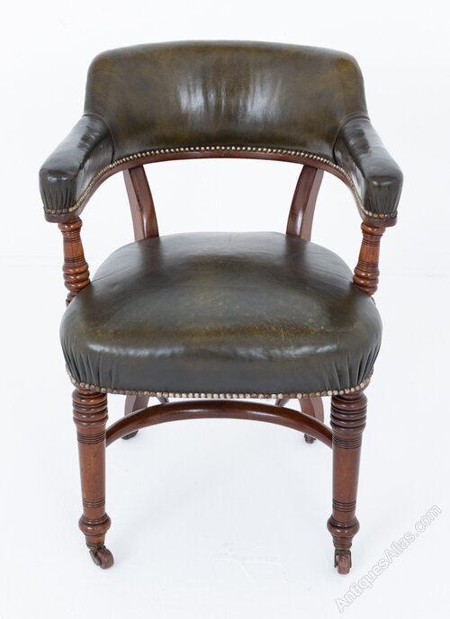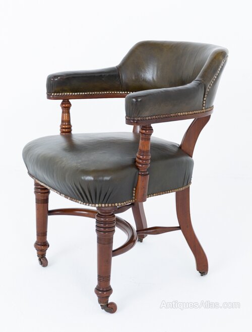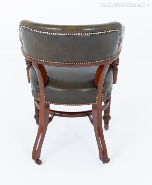 Good Quality Mahogany and Leather desk Chair.This Chair is Raised Upon Ring Turned Legs with Porcelain Castors and a Shaped Stretcher.