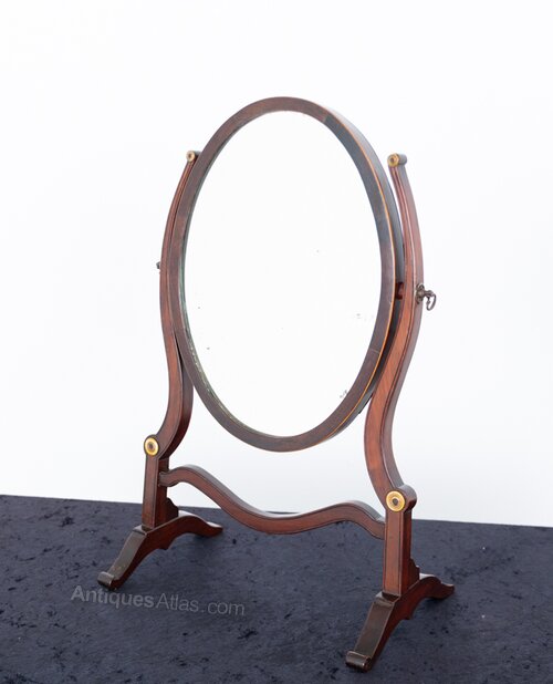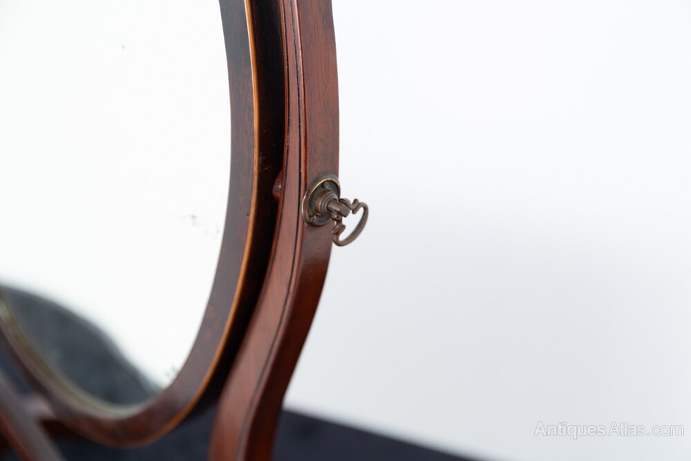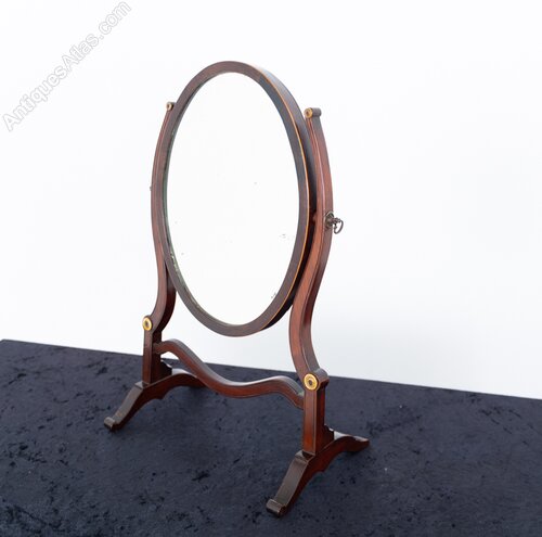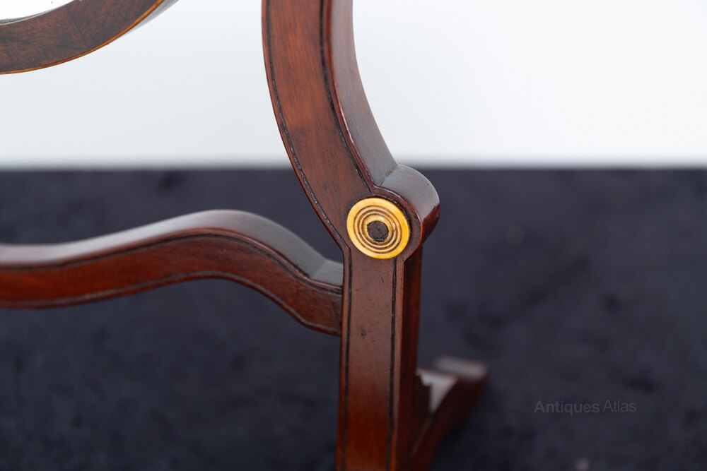 Sheraton Style Mahogany Oval Toilet Mirror.This Mirror Stands Upon Shaped Feet with Shaped Supports and a Shaped Stretcher.