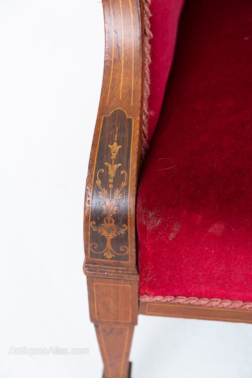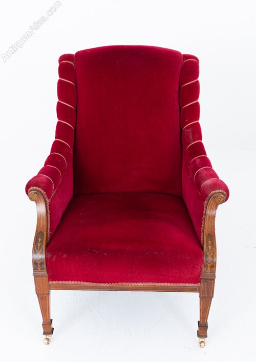 A handsome Sheraton Revival club chair, raised upon elegant tapered legs terminating in brass castors.The gracefully shaped arm supports feature refined inlaid detailing, reflecting the delicate craftsmanship associated with the Sheraton taste.