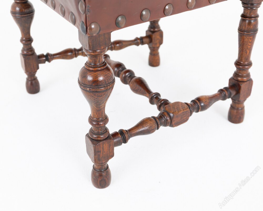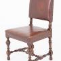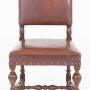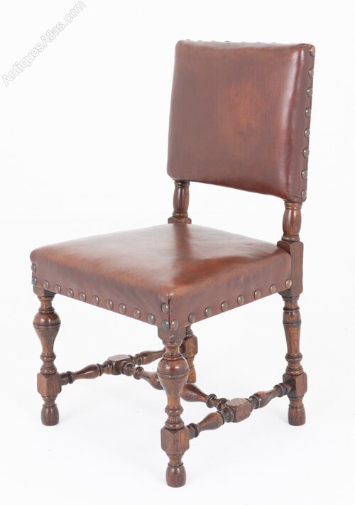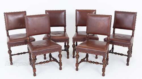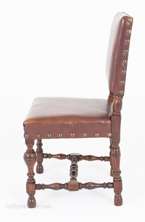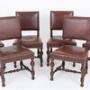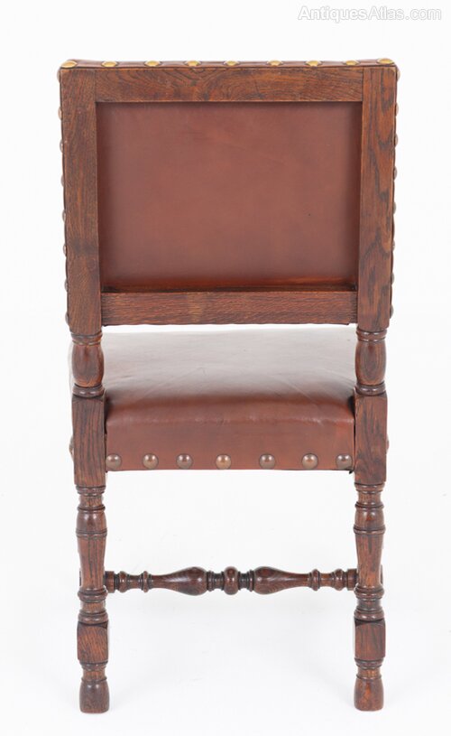 A rather impressive set of six Tudor Revival oak dining chairs of generous proportions.The chairs retain their original leather upholstery, finished with decorative brass studwork, which complements the character of the period style.