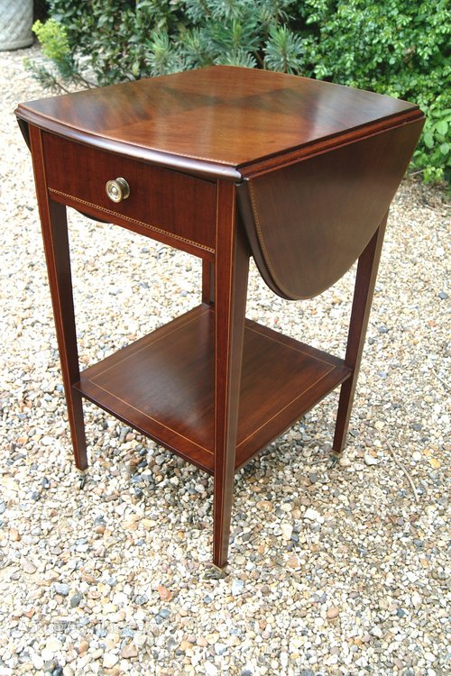 Pretty and fine quality Edwardian mahogany and chequer banded small Pembroke table, having a quarter veneered top of oval form when open, above a single drawer, raised on square tapering legs united by an under-tier with original brass shoe castors.DateEdwardian :