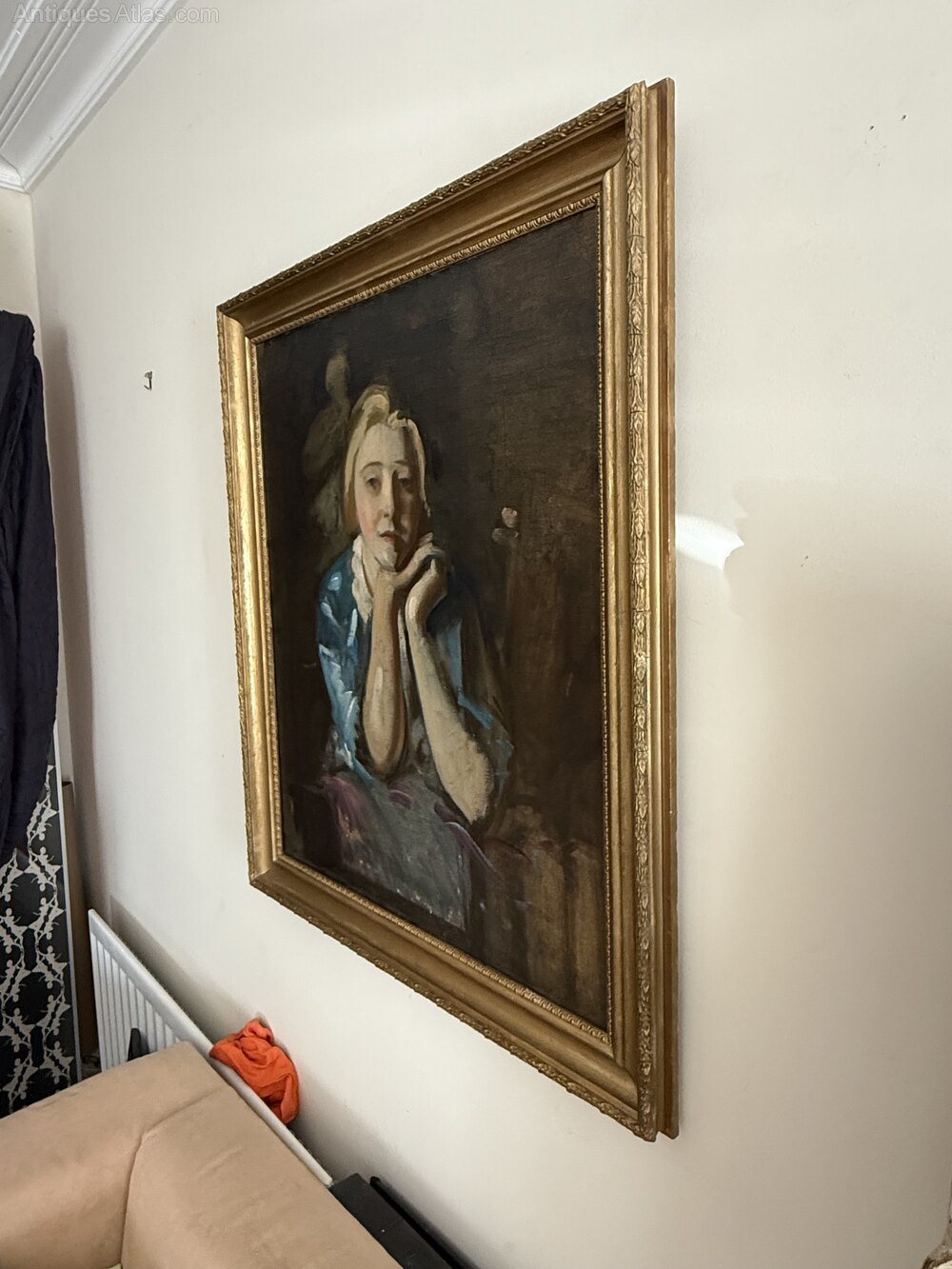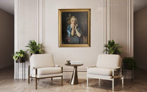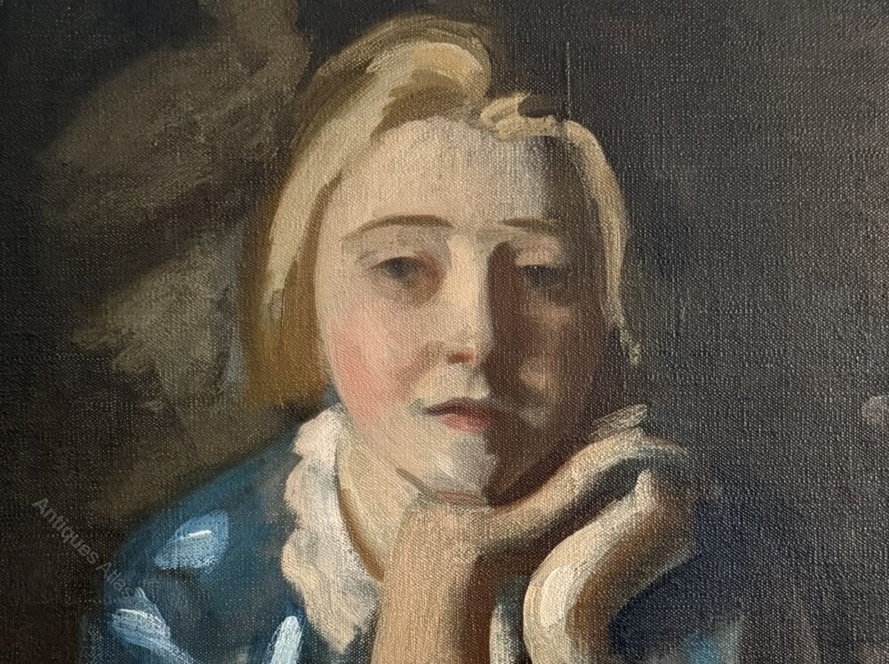 One of the subjects of Wilfrid's paintings during this period was Model, Blue Dress, Brittany. The composition and demeanour of the sitter in the painting reflects a similar artistic approach seen in Sargent's formal portrait of his niece, Rose Marie Ormond, who was also depicted wearing a cashmere shawl in 1912.