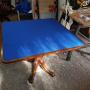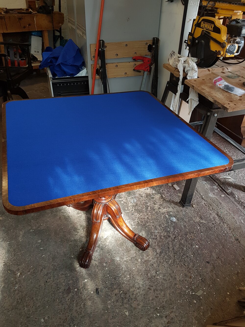 A Victorian mahogany folding card table, the top in quarter laid book-matched veneer with surrounding holly inlay and mahogany crossbanding. The table swivels and opens to reveal a later unmarked royal blue playing surface and a small receptacle for cards. The top is raised on an ornate solid mahogany turned and attractively carved central column with four intricately carved legs terminating in the original brass castors. The top is approx 184 cm square when open, 92cm wide when closed.DateVictorian