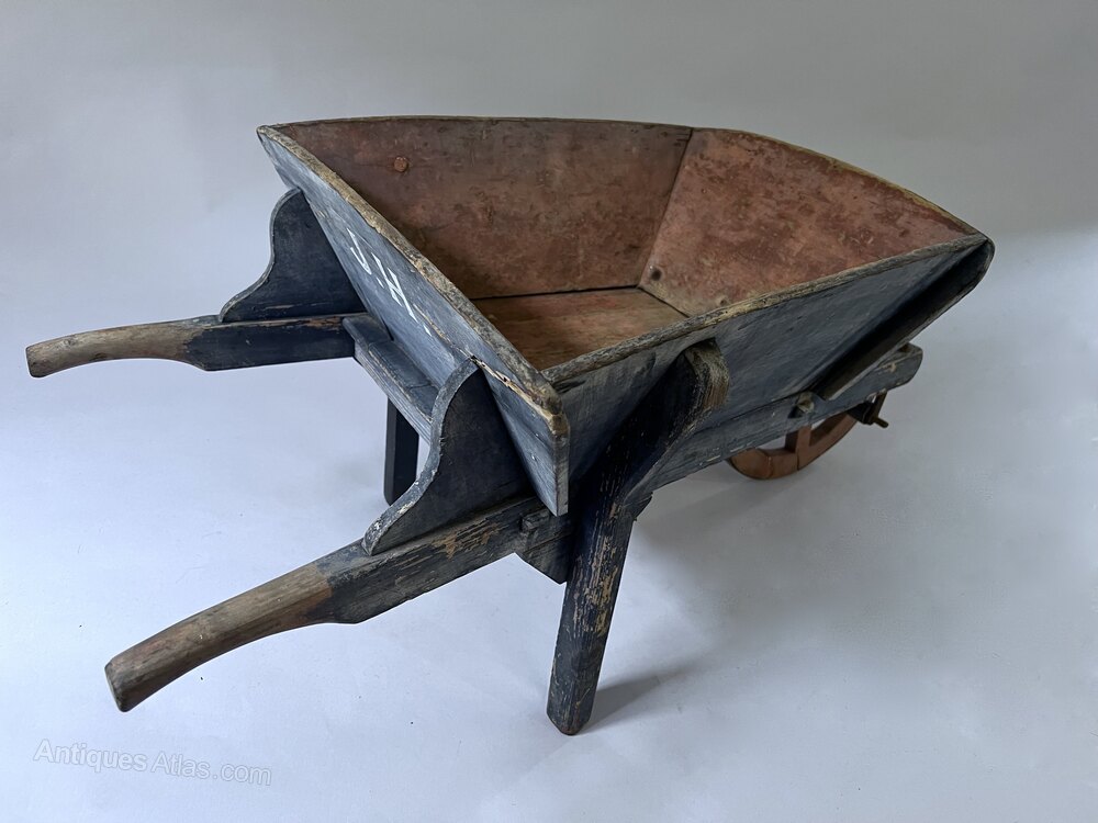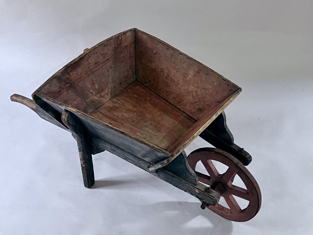 A charmimng antique child's painted wood wheelbarrow. It is rustic but well made. The wooden wheel retains its original iron band. It has had a fracture to the back, otherwise it is in very good condition. Circa 1900Length: 90cm