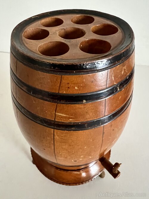 Mid 20th century cigar table dispenser in the form of a barrel. The turned wooden barrel is carved to simulate a coopered/banded barrel, with painted bands. It holds 7 cigars, with the small wooden spigot providing a simple press mechanism that raises the cigars. The barrel sits on 3 small feet. A small break in the wood in one place attests to its age, otherwise this fun piece of table treen is in very good consition and was probably made on the Continent. Circa 1930Height: 21cm
