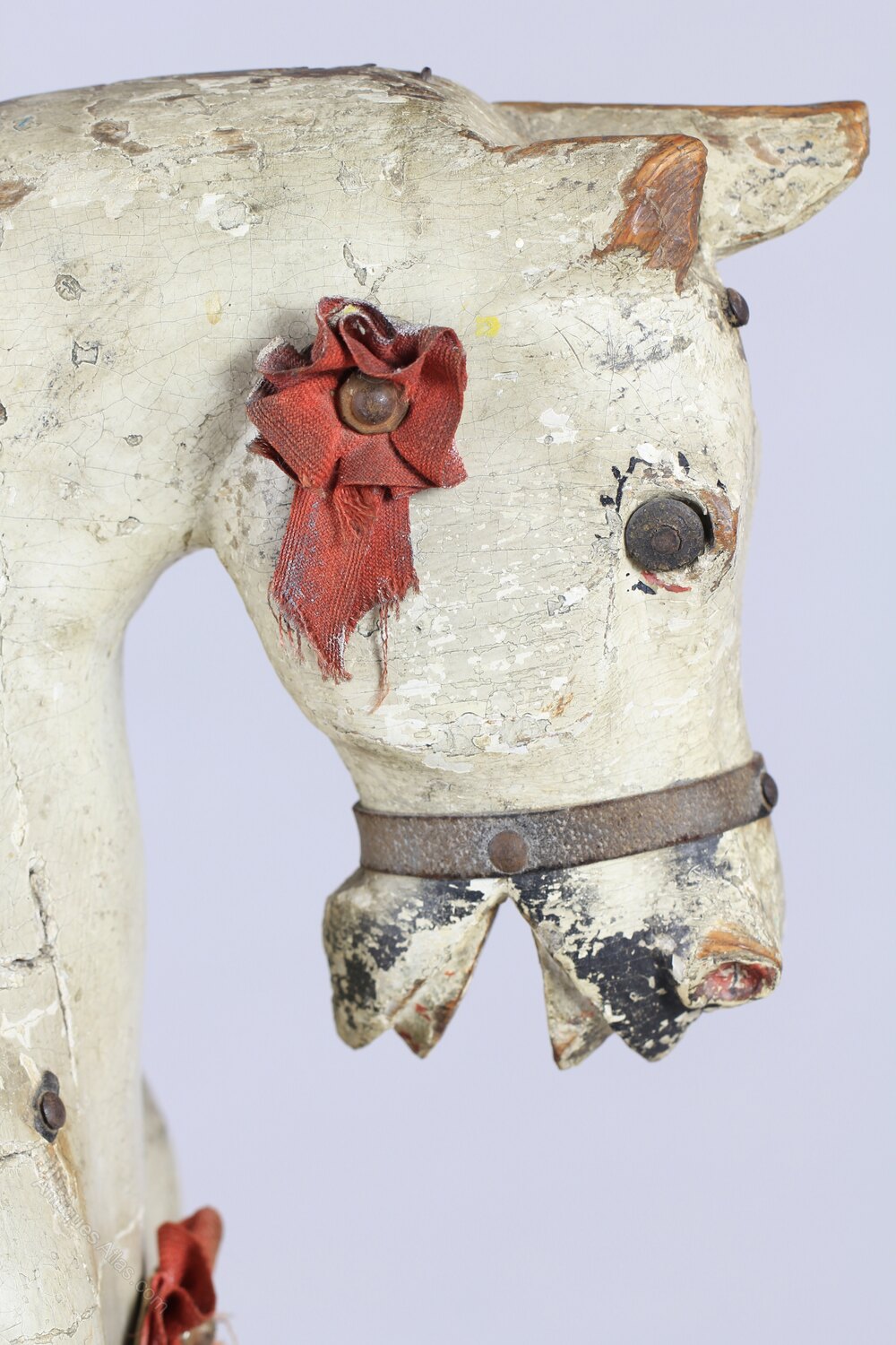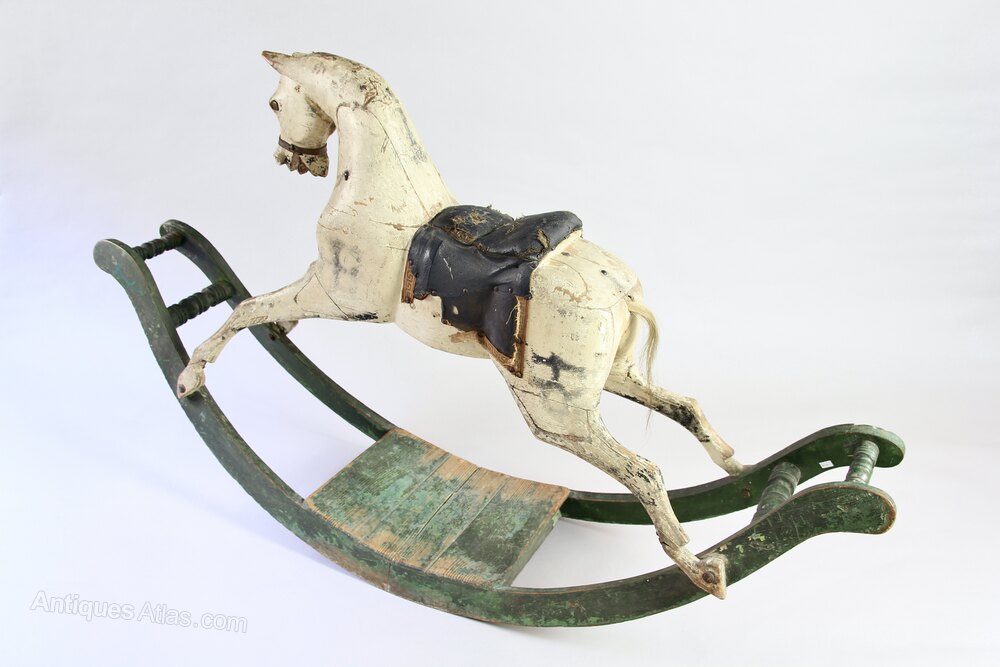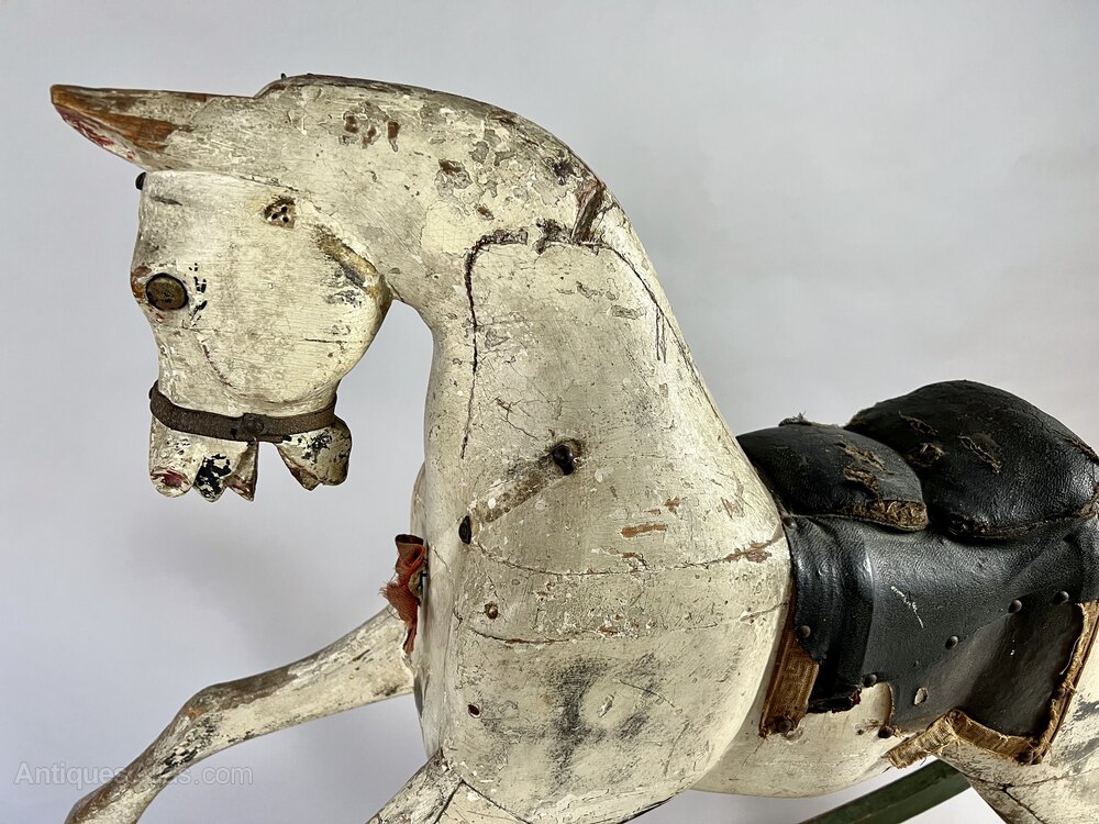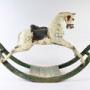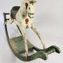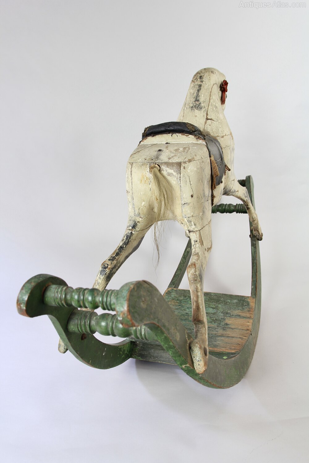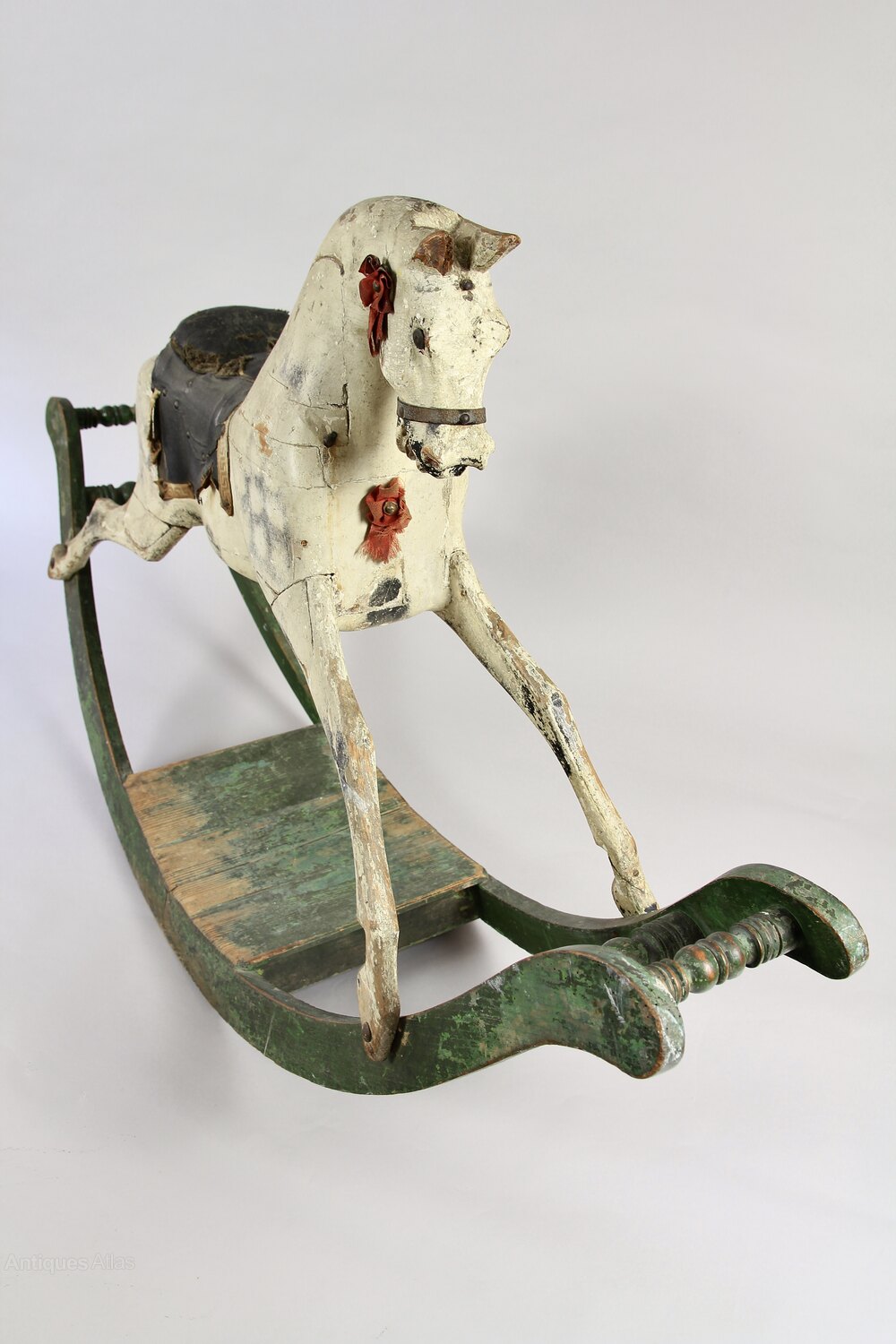An early carved wood childs rocking horse. Dating from the mid 19th century, it has an original painted finish, the dappling on the horse faded and worn with use. The stuffed saddle has seen many rides!The horse sits on original bow rockers, painted green.This charming antique rocking horse is rare, as it has not been re-furbished, and needs to be enjoyed in its originality.