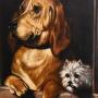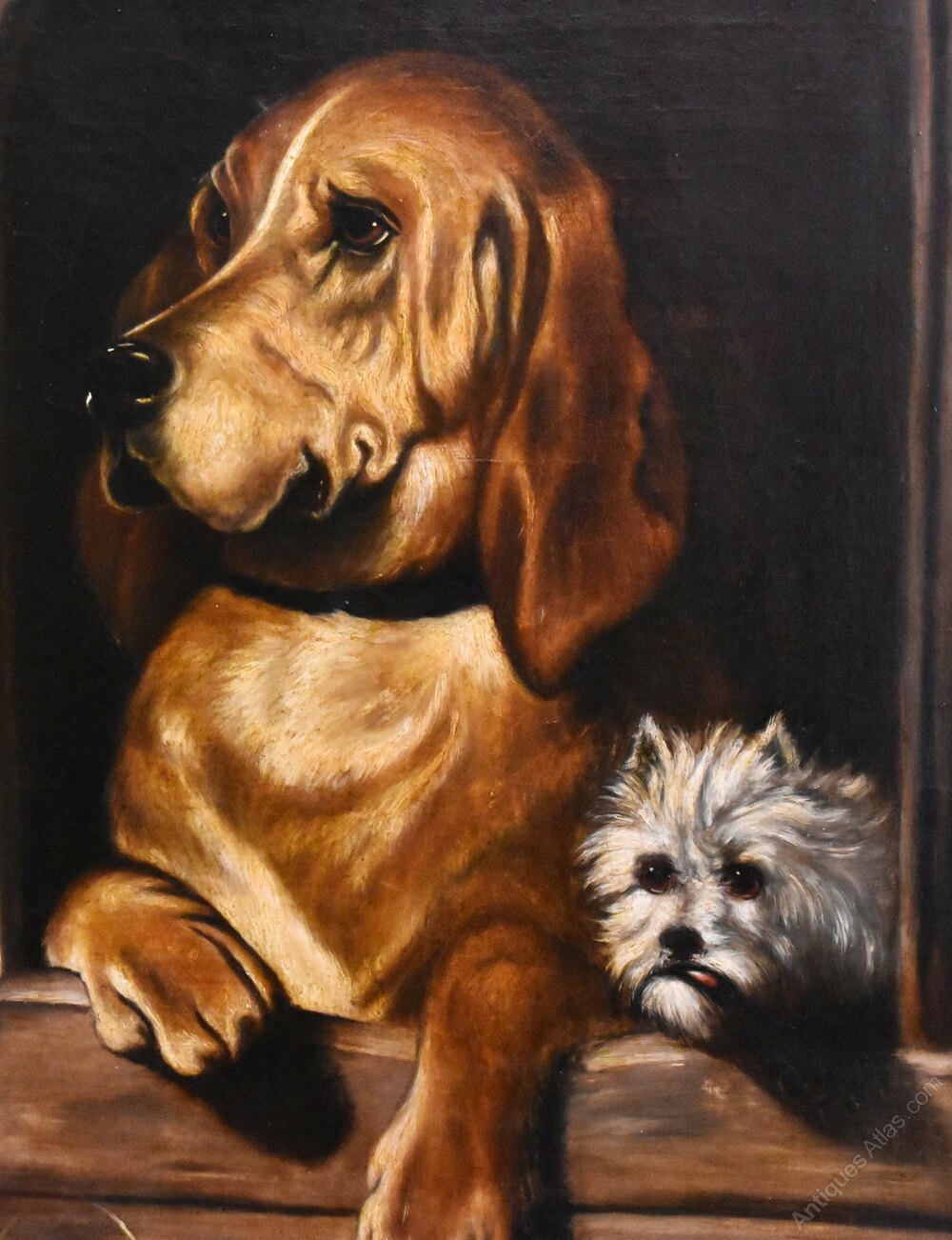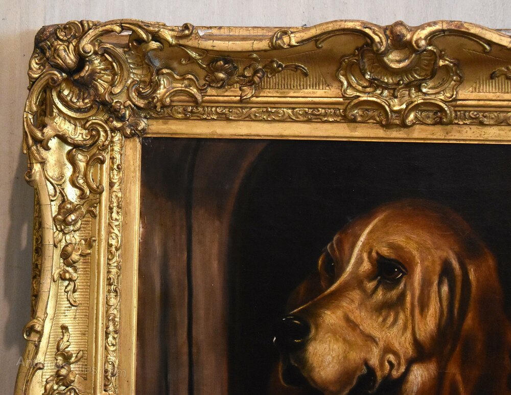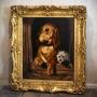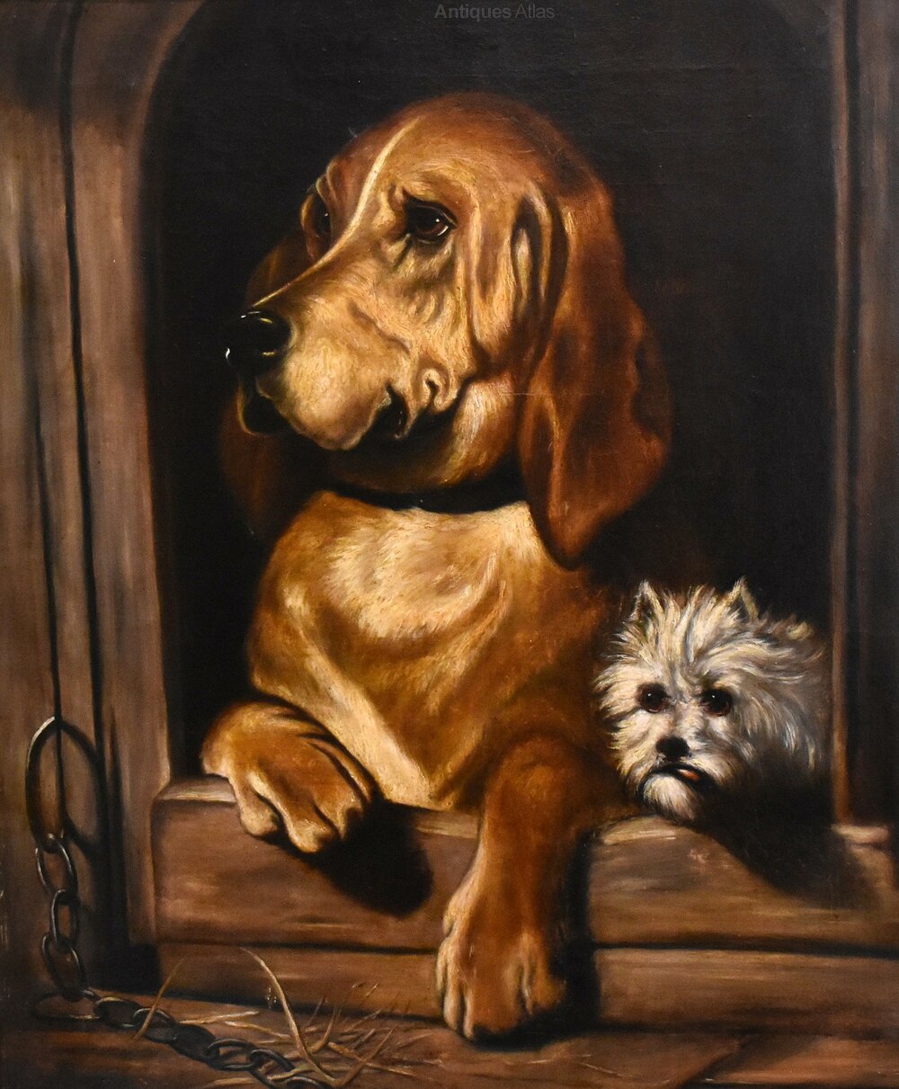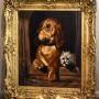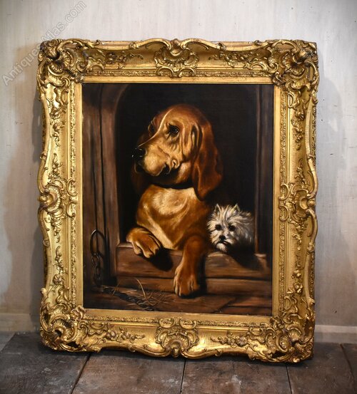 A superb oil on canvas painting after ‘Dignity and Impudence’ by Landseer. The work is an exceptional period copy of this well-known painting. The original was painted by Landseer in 1839 It features a bloodhound and a much smaller West Highland terrier, their sharply contrasting personalities reflected by the title. In life the dogs were named Grafton and Scratch and belonged to the chemist and politician Jacob Bell who commissioned the original picture. Landseer was the highest regarded animal painter of the Victorian age and Bell collected several of his works. The painting was displayed at the British Institution's 1839 exhibition in Pall Mall and later featured at the Manchester Art Treasures Exhibition of 1857. It was donated by Bell to the National Gallery in 1859 and was later transferred to the collection of the Tate Britain. This is as fine a copy as I have ever seen and like most copyist works is not signed. It is in excellent condition with a very minor hole repaired. The work retains the original superb quality gilt frame which is in excellent untouched condition with only a few minor pieces of restoration. The whole is the most wonderfully decorative work with a huge amount of charm and presence. C.1840.Overall sizes in inches including frame: 35 ¼ by 40 ¾