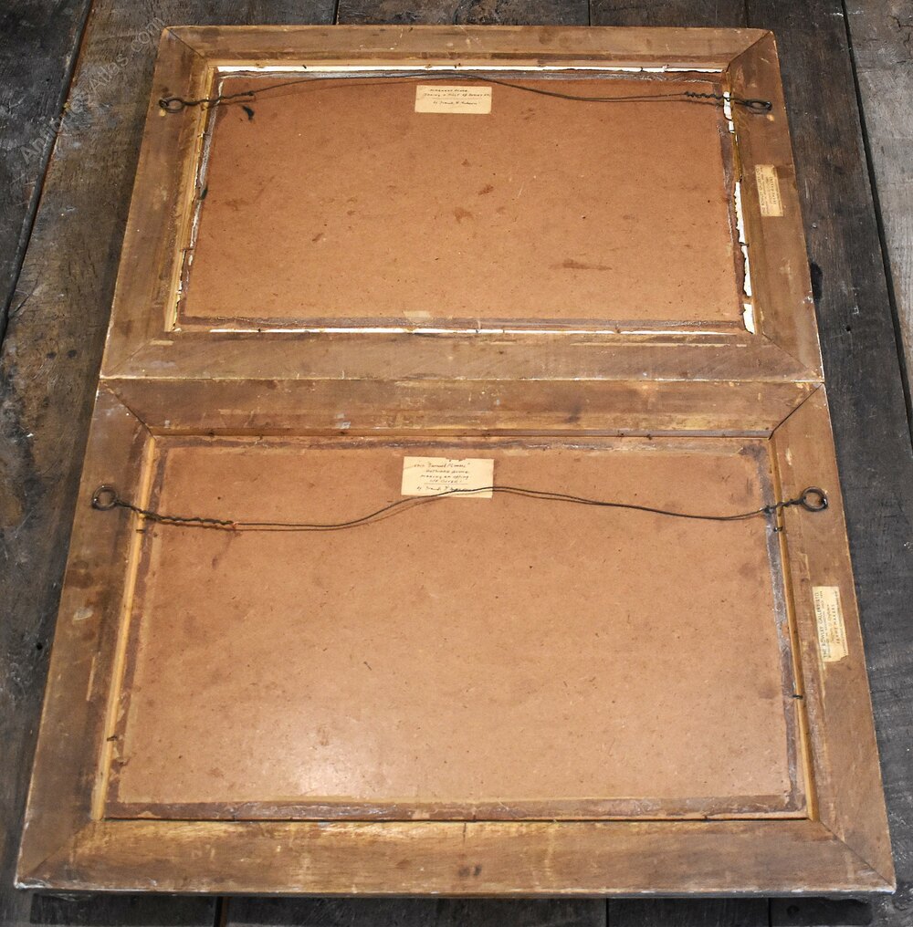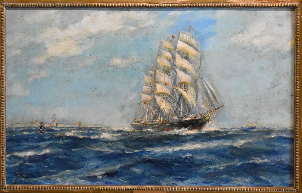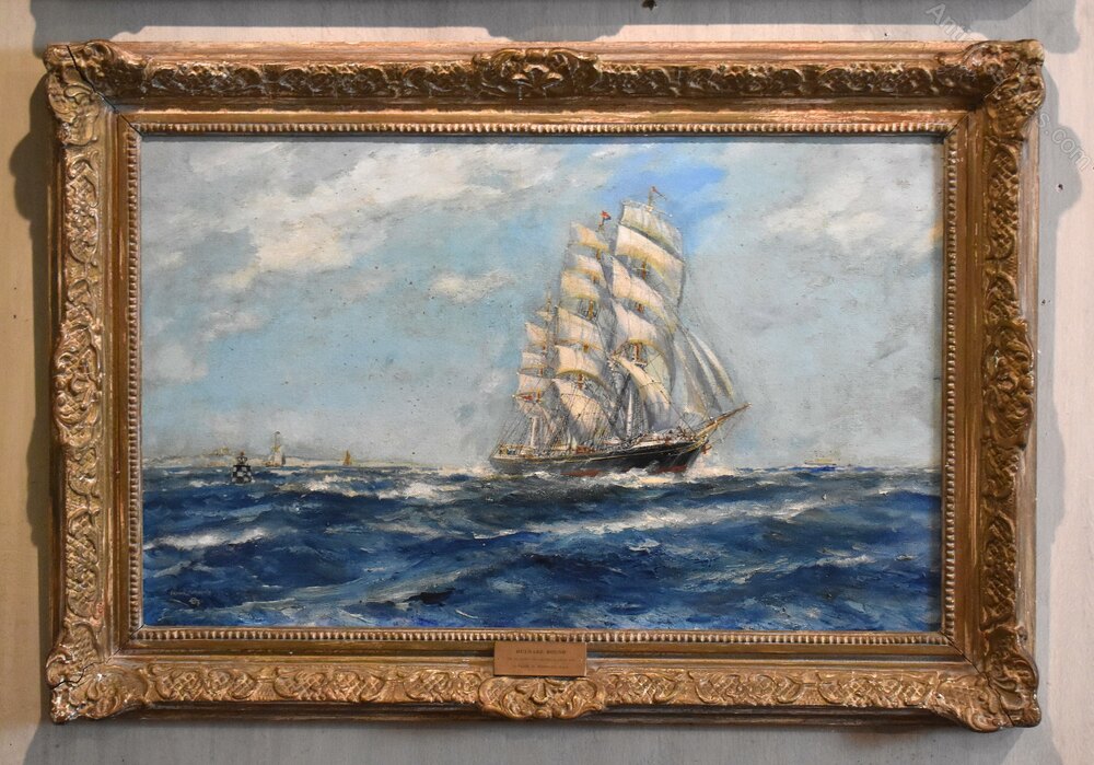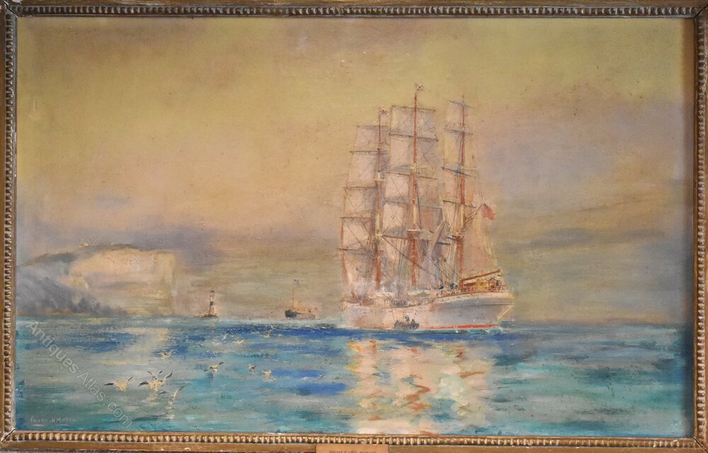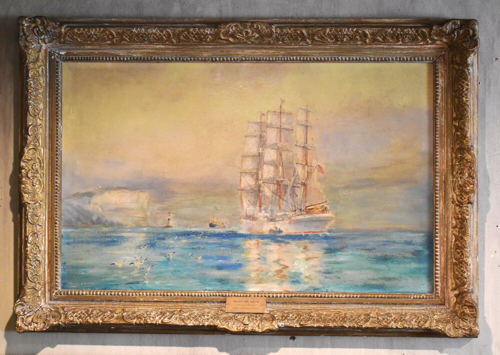 A pair of marine oil paintings by Frank Henry Mason 1875-1965, one painted on paper and the other on hardboard. The pair or typical of the artist’s work with a subject of tall ships painted in a light impressionist manner. One painting is titled on the frame ‘Homeward Bound, the long tricks over’ the other is titled ‘Outward Bound, the out trail-the trail that is always new’ both works are similarly titled on the reverse. The two paintings are fully signed to the lower left. The pair are in good condition but do show signs of touching in and overpaint in areas. Frank Henry Mason was a highly skilled, largely self-taught artist. His art was influenced by a lifetime of working and living by the sea, he is best known for his maritime paintings of harbours, coastal views and vessels at sea. Mason was born in Seaton-Carew, Hartlepool in 1875. As a boy, he worked at sea with his grandfather, before training as a navy cadet and settling on a career as a steam ship engineer, in Scarborough. Having always had an interest in drawing, he began spending time with a group of local artists who lived in the nearby fishing village of Staithes. They became known as the ‘Staithes Group’. By 1900, Mason had become a full-time artist and the Staithes Group was thriving. They officially formed the Staithes Art Club in 1901, with over 30 members. Their paintings, often documenting local life, attracted national attention and were regularly shown in galleries until 1907, when the official group disbanded. As well as being a member of the group and an established, well-respected artist in his own right, Mason also had a career as a commercial artist. This included illustration and Railway Art. He produced over 200 posters for the railway companies – some of the most iconic of the 20th century. These included designs for the London and North Eastern Railway (LNER), where he was one of their ‘big five’ designers. Mason’s work was exhibited at the Royal Academy from 1902 onwards, and he was elected to the Royal Society of British Artists in 1904. He remains a popular and well-known artist with works in collections including the Imperial War Museum, the National Maritime Museum and the National Railway Museum. This pair of paintings are very commercial examples of Mason’s work with the original Rowley Gallery frames. The works make a decorative pair and are ready to hang. C.1920Overall sizes in inches each including frames: 29 ¼ by 20
