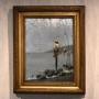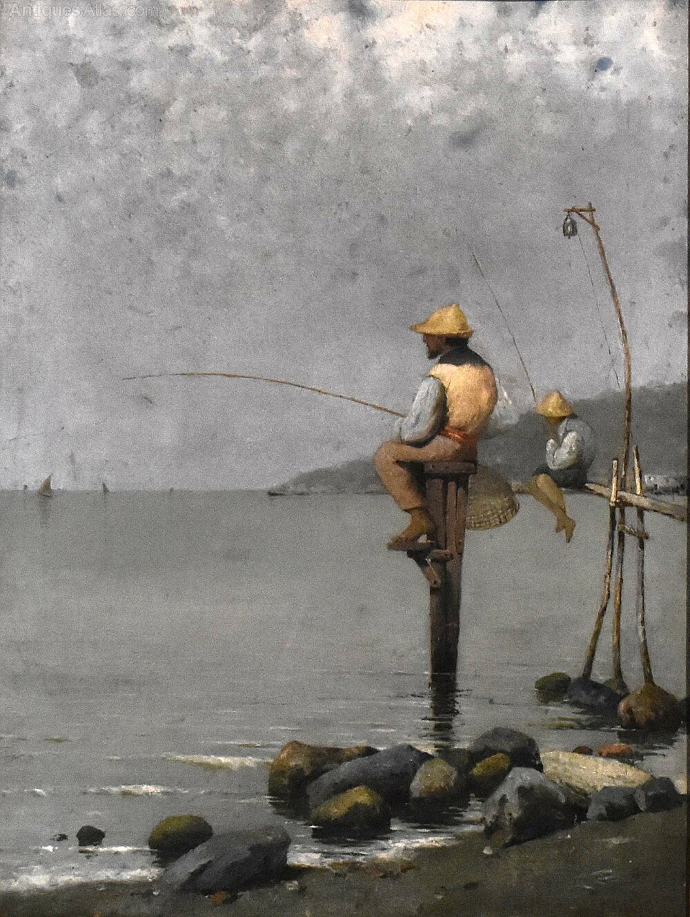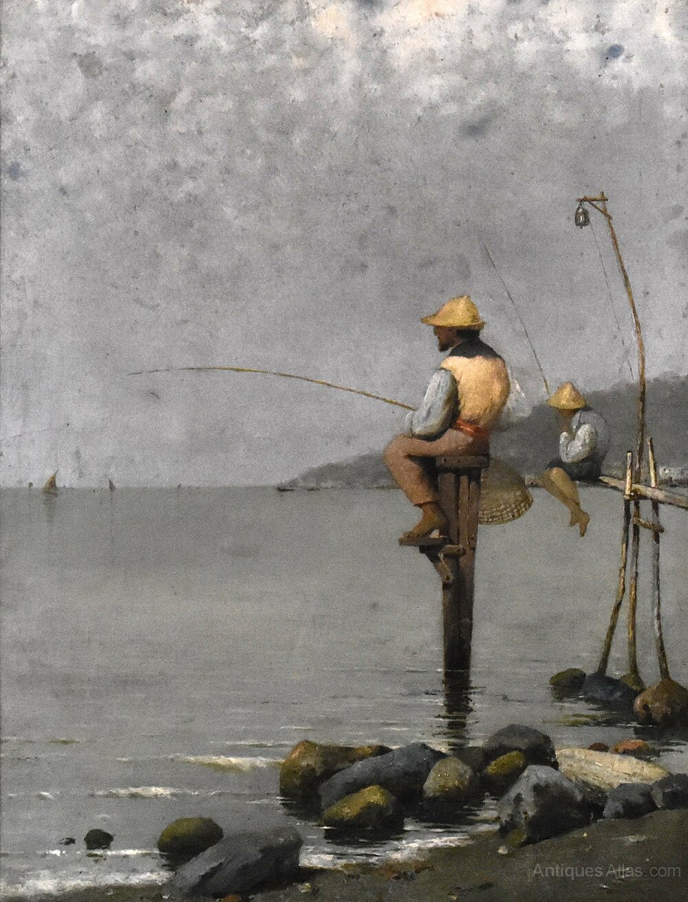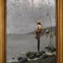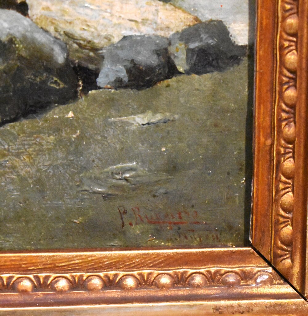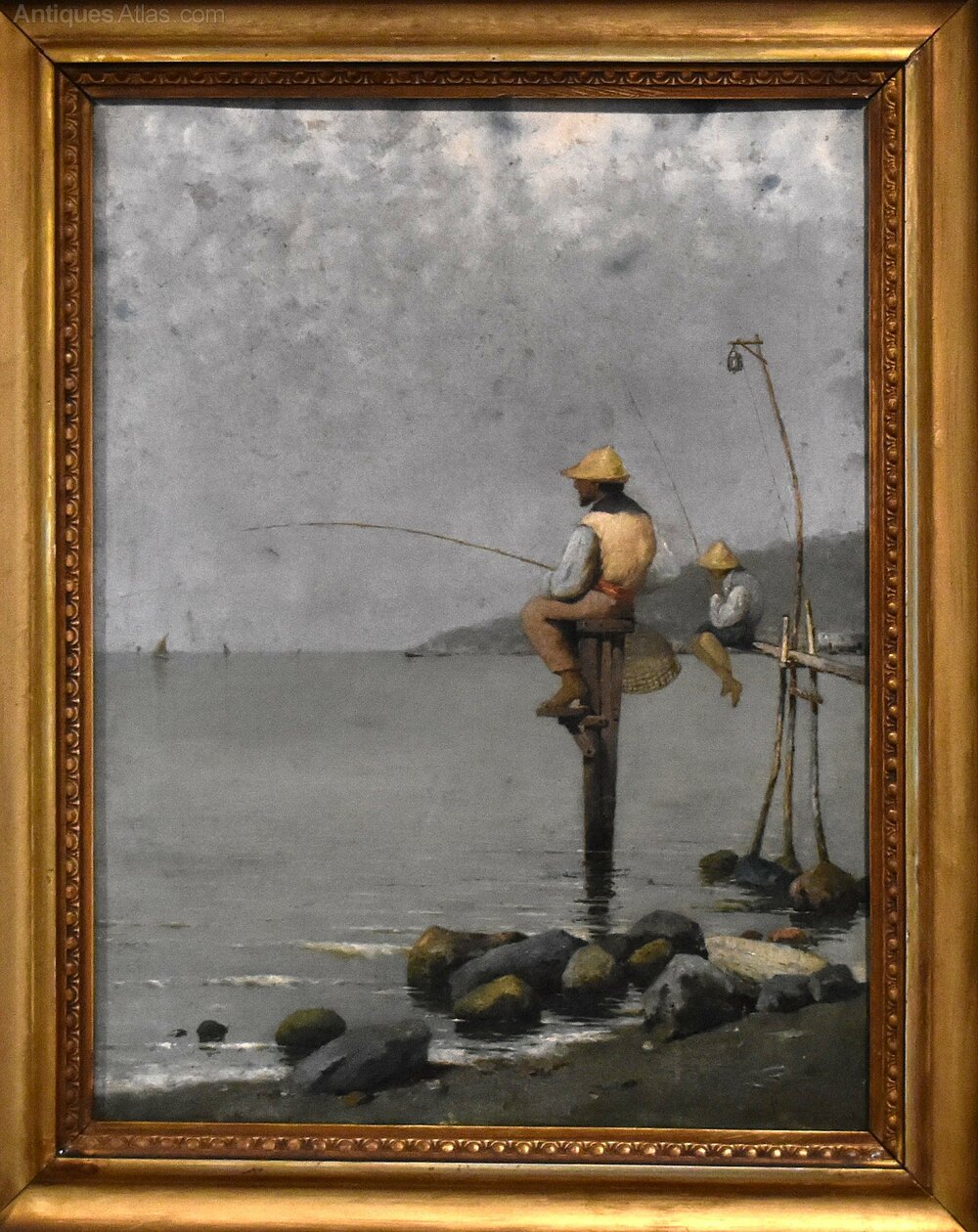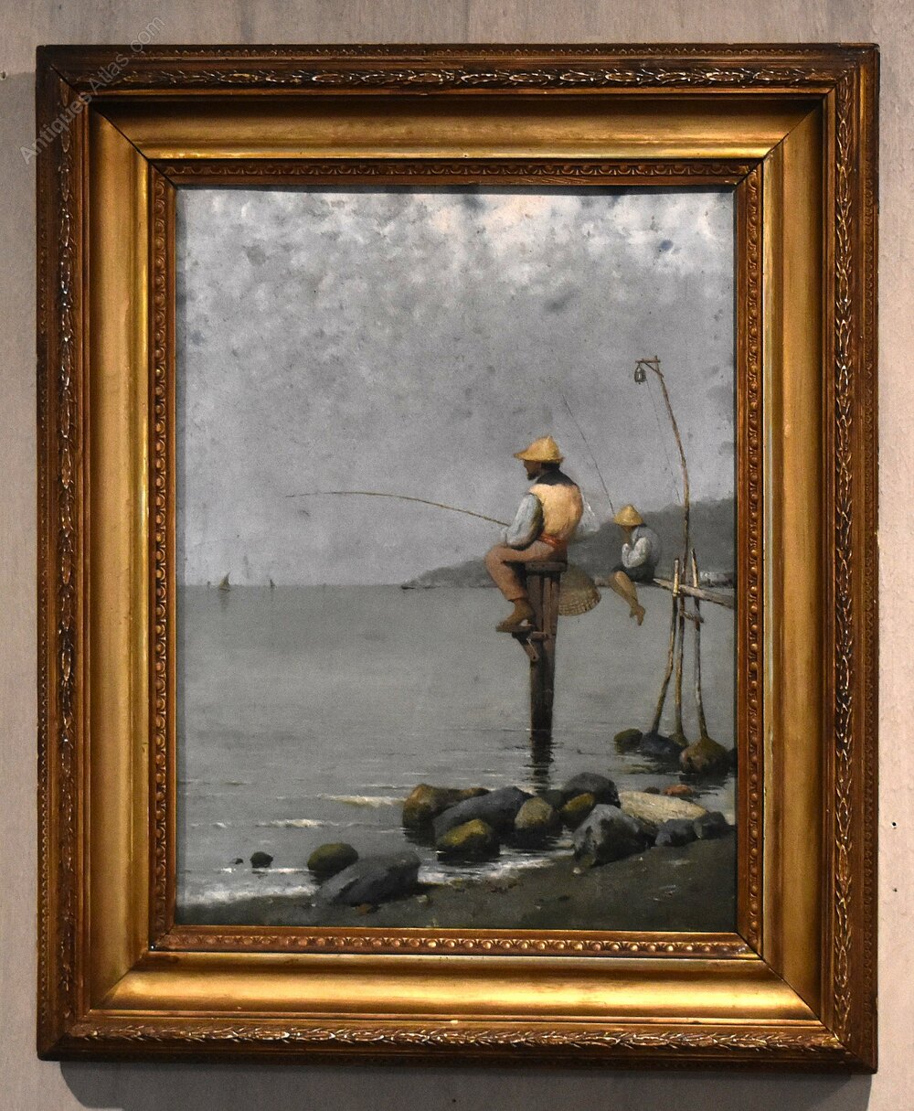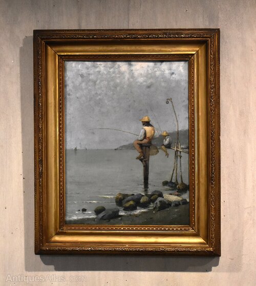 A superb oil on canvas depicting fisherman in the bay of Naples, by the Italian artist Pasquale Ruggiero 1851-1915. The scene depicted shows fisherman perched on platforms, fishing in the very early morning with a hazy sky. The work is an excellent example of Italian realism by a highly regarded artist, and is signed and inscribed 'P. Ruggiero. Napoli' to the lower right. Pasquale Ruggiero was born in Salerno and died in Naples where he spent the majority of his working life, he exhibited in Naples and elsewhere in Italy, including Milan. His work is always realistic but carries a strong feel of the romance of Italy and the Italian people. This is a fine and interesting example of his style and is in good condition with some minor marks and touching in. The painting is framed in a period gilt frame but it would not be the original, however it works very well with the piece. C.1890.Overall sizes in inches including frame: 15 ¾ by 19
