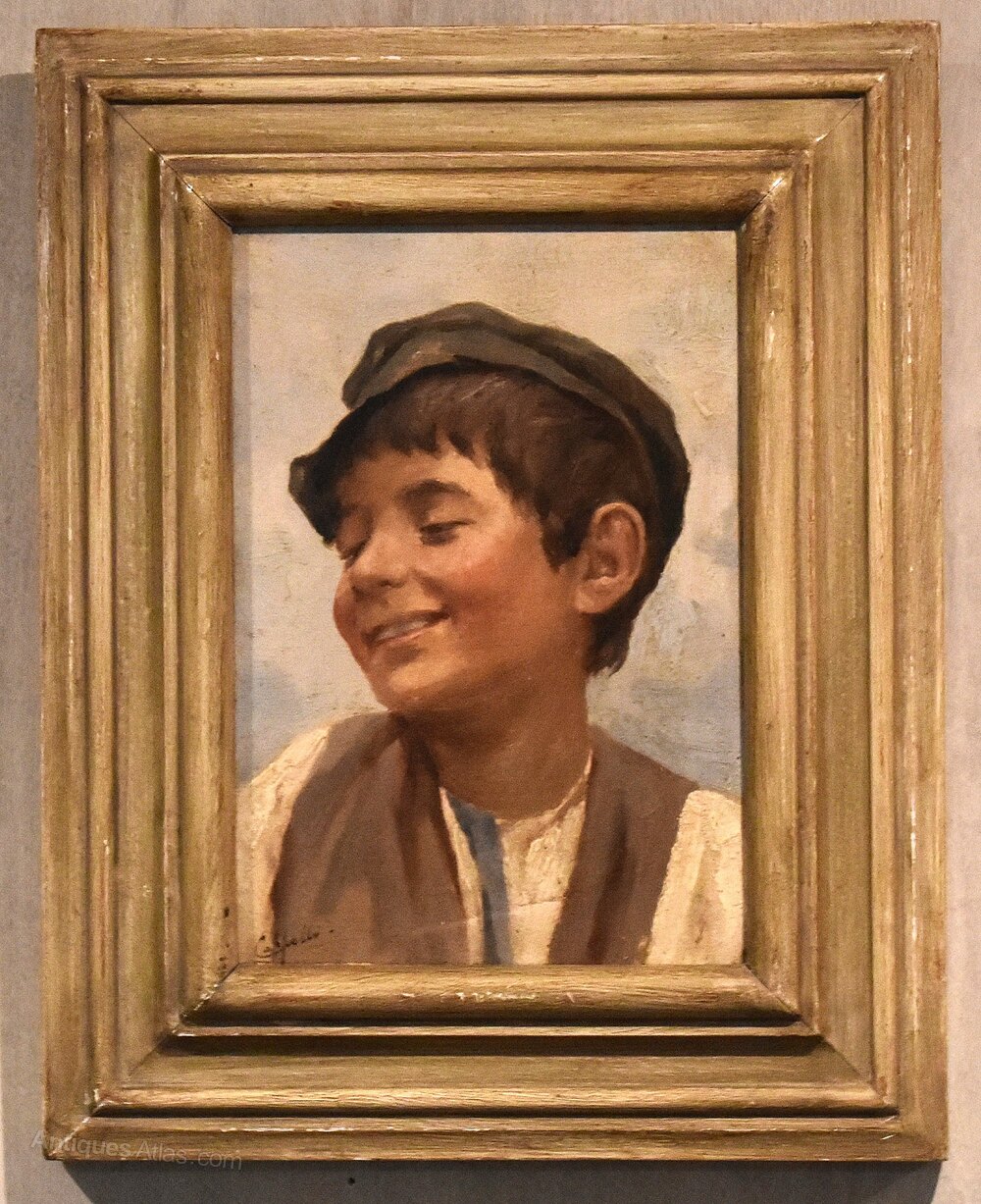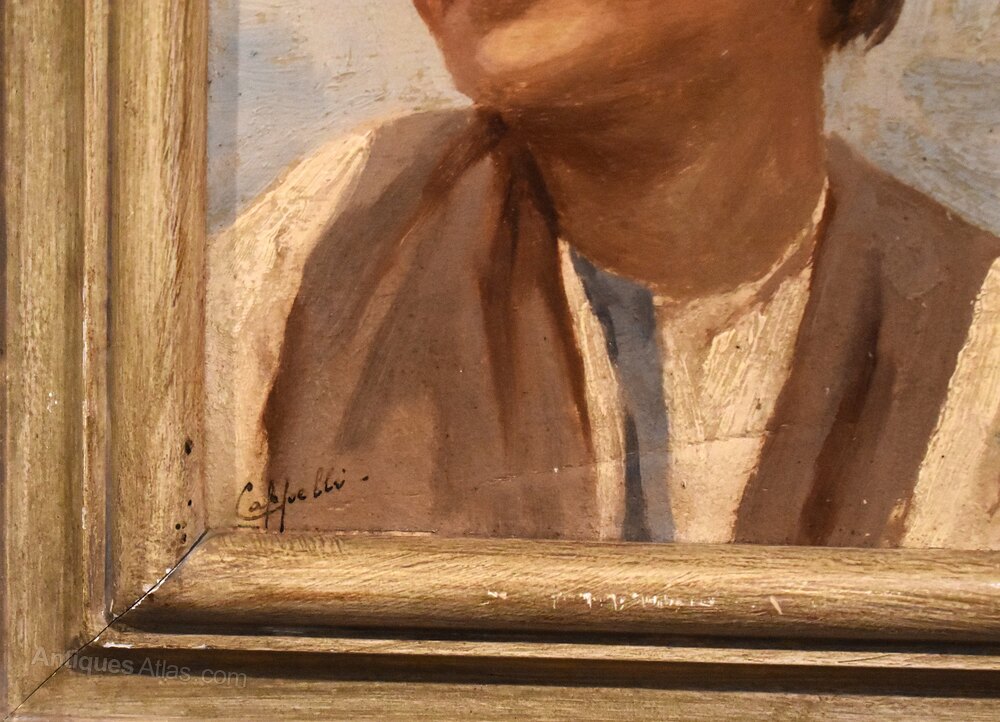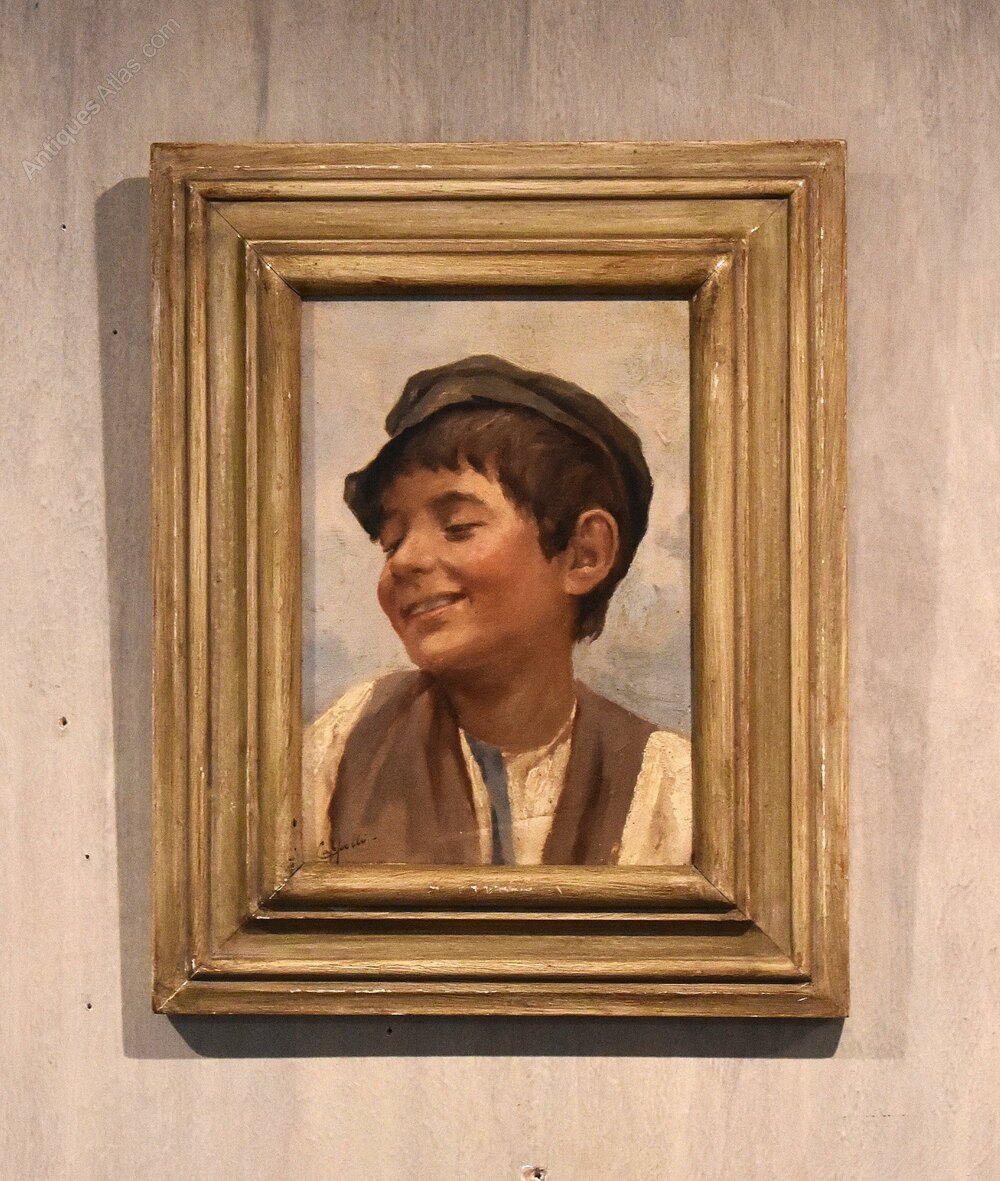 A charming oil on wooden panel by the Italian artist Evaristo Cappelli 1869-1951. A beautifully worked oil portrait perfectly capturing the Italian boy in a slight impressionist manner. The work is signed Cappelli to the lower left. Evaristo Cappelli was born in Formigine in 1869 and died in Modena in 1951. He attended the Institute of Fine Arts in Modena, where he subsequently taught. He was a frescoist and set designer as well as a realist painter, however later works are influence by Italian Art Nouveau, with this being an excellent example. The painting is in excellent untouched condition and retains the original painted frame. C.1920.Overall sizes in inches including frame: 10 ¾ by 13 ½