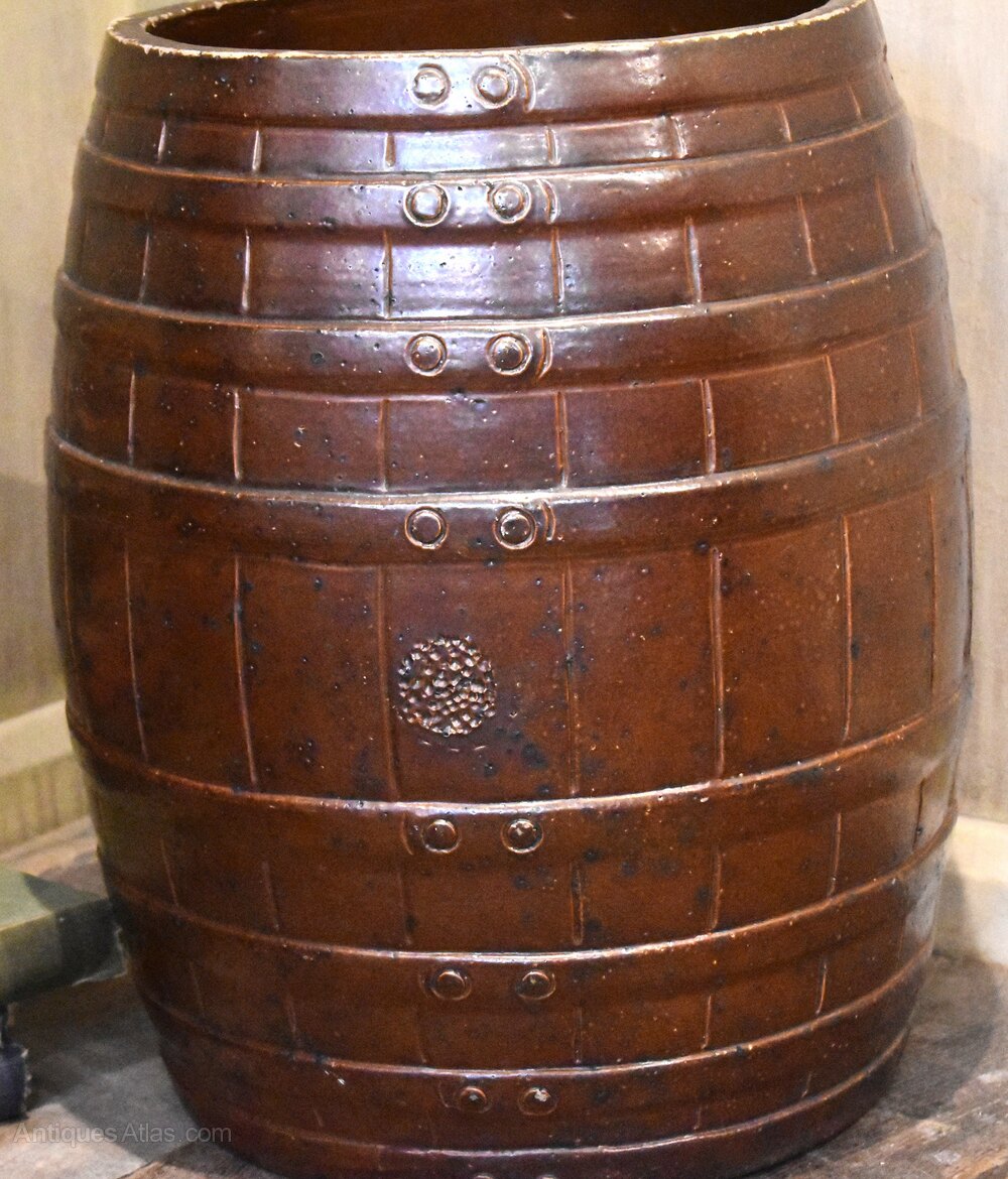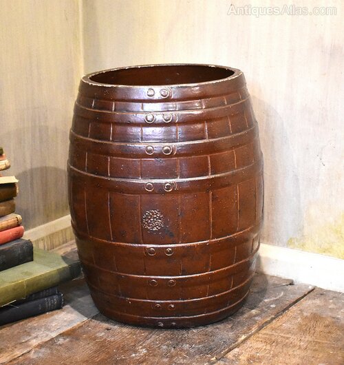 A large and decorative saltglaze stoneware barrel. The barrel was made as a container but makes the perfect walking stick and umbrella stand. It is beautifully modelled as a realistic coopered barrel with straps. The piece is in excellent condition and was probably made in Nottinghamshire or Derbyshire. C.1880.Overall sizes in inches: