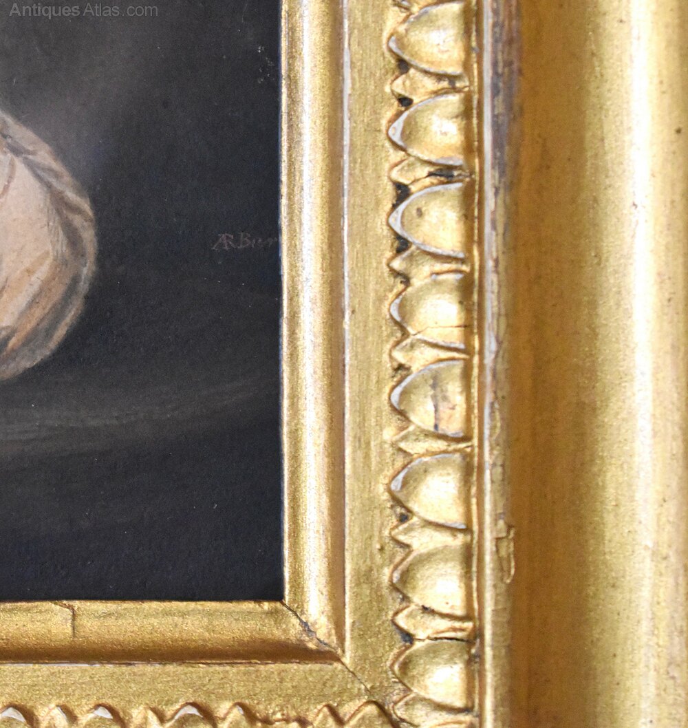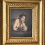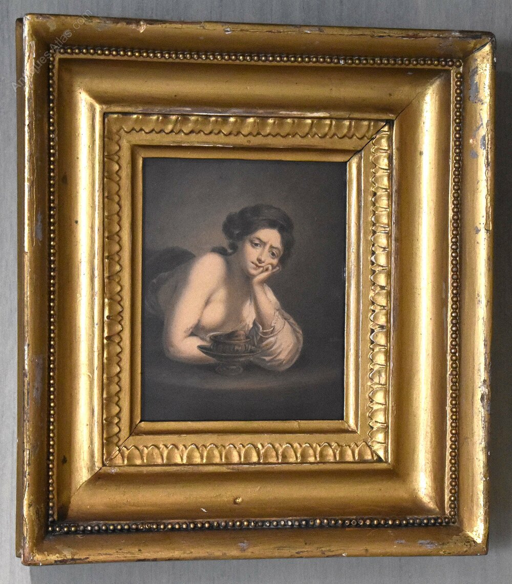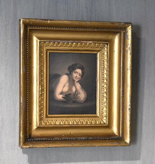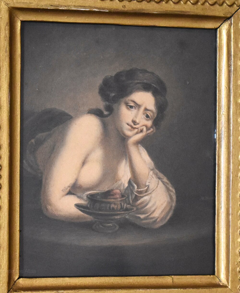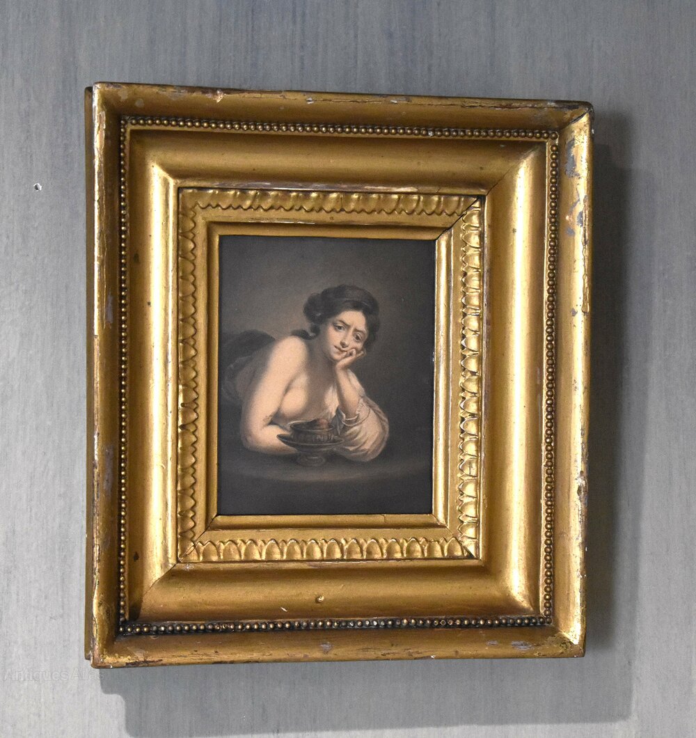A fine watercolour depicting Sigismunda weeping over the heart of Guiscardo from The Decameron, by the artist Albin R Burt 1783-1842. The scene is worked in minute detail and of stunning quality. The painting is in good condition with just the usual minor fading with time. It is signed to the right ‘A R Burt’. Albin Roberts Burt was born in 1783 the son of Harry Burt and Mary (nee Roberts). His brother was secretary to Lord Nelson and his mother was an intimate of Emma Hamilton. He trained as an engraver under Robert Threw and Benjamin Smith but later turned to portraiture. He exhibited at the Royal Academy from 1807-1830 while living in London but he worked as an itinerant portrait painter travelling around the whole country. This work is interesting for the artist and was inspired by a painting of Hogarth’s completed in 1759. The gilt frame is the original with some overpaint. The whole is an interesting and decorative Georgian work. C.1820.Overall sizes in inches: 8 ½ by 9 ½