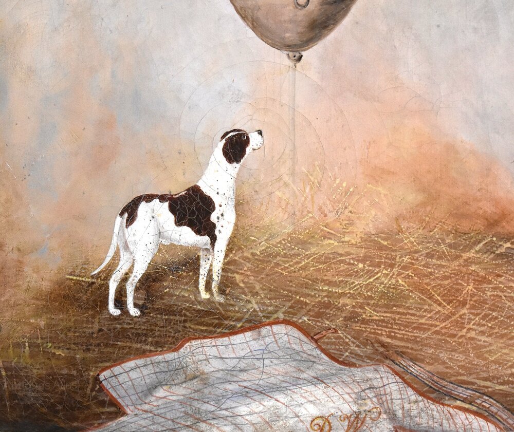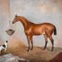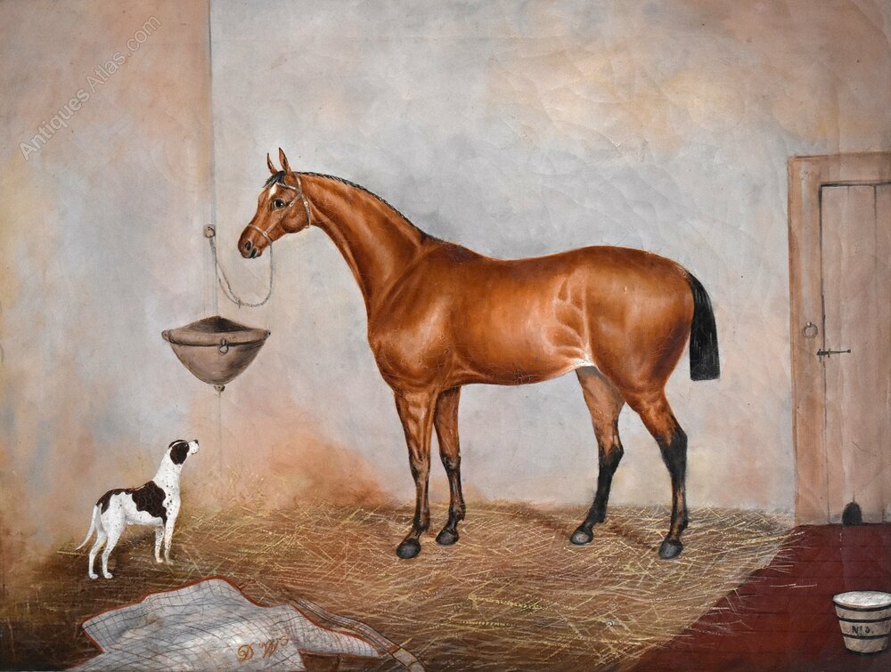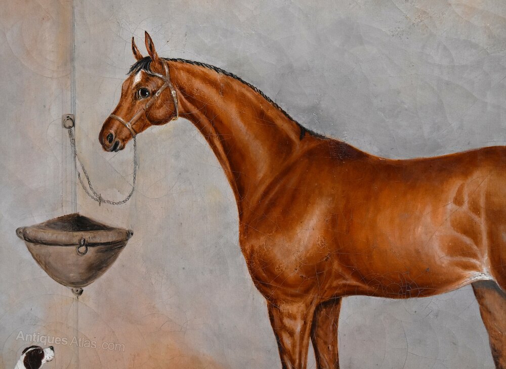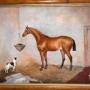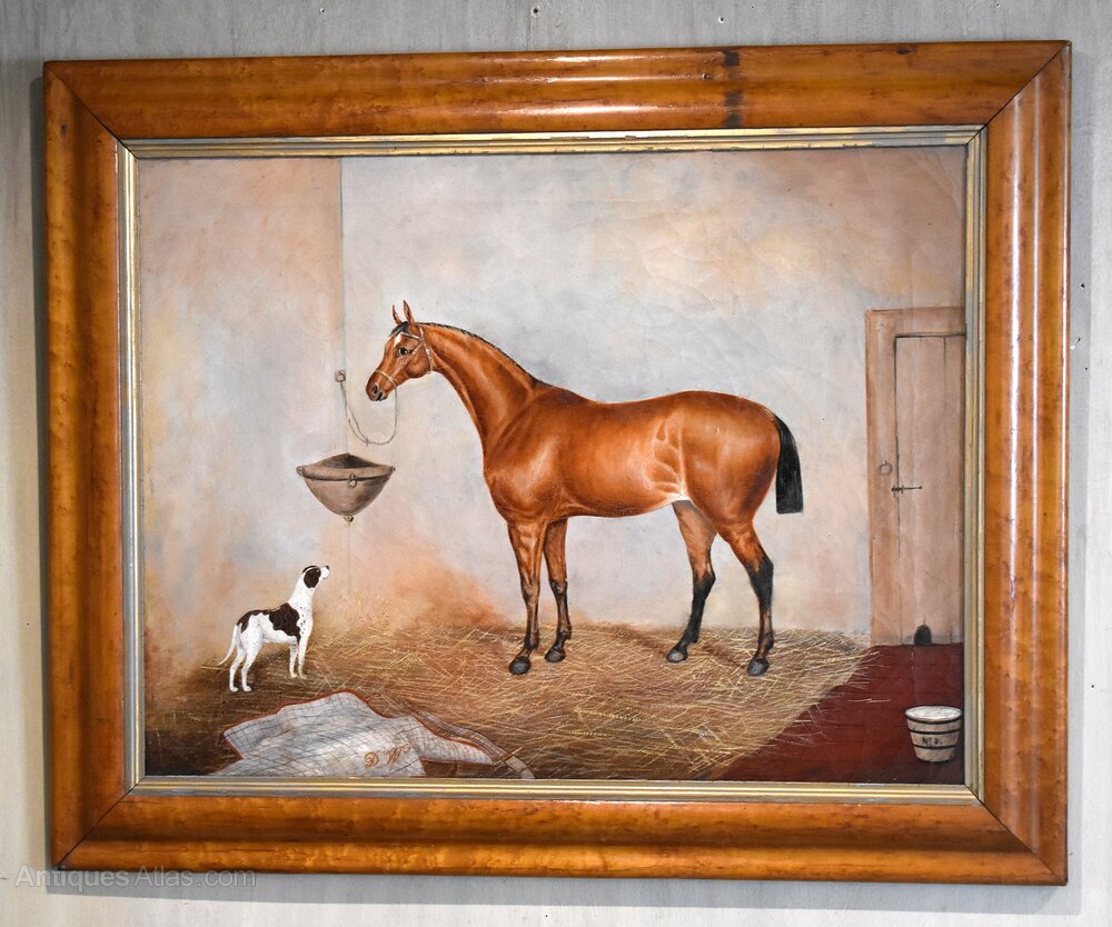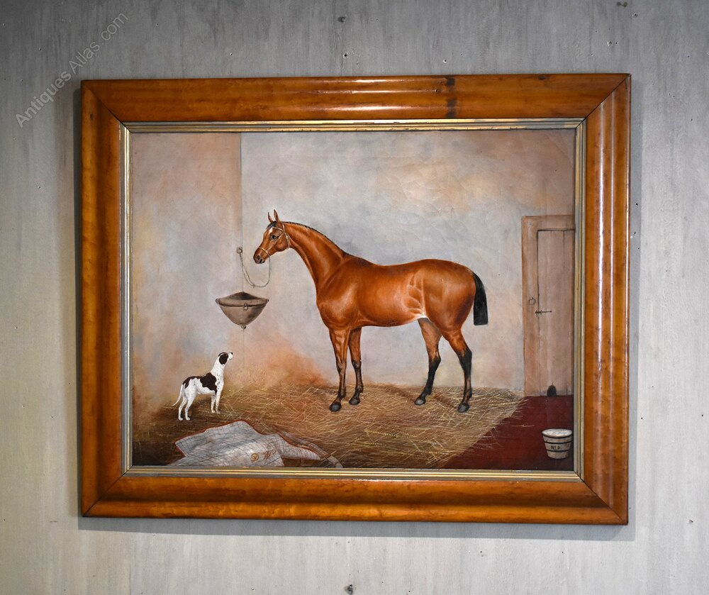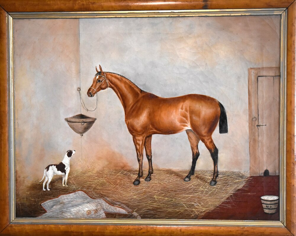 A fine horse portrait oil on canvas by the artist George E Sharpe of Lincoln. The work is typical of Victorian horse portraiture with the animal dominating the work in a stable setting and including a dog looking up at the animal. The painting is signed on the reverse George E Sharpe of Lincoln, who is an unknown artist but would have been an itinerant painter travelling around working on commissions of the animals of wealthy patrons. The work is in very good condition, it has had a tear professionally repaired and some minor touching in, with a slight overall craquelure which is typical of this type of painting. The birds eye maple frame is the original, in excellent condition and with a beautiful patina. The whole is a fine example of horse painting of the nineteenth century with a huge decorative impact. C.1870.Overall sizes in inches including frame: 31 ½ by 25 ½