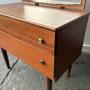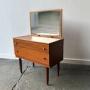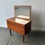 A compact and petite Mid-Century chest of drawers with mirror in rich-toned wood, supported on turned teak legs. It has two drawers with attractive round faux brass pulls. A mounted mirror sits neatly on the top surface.The mirror can be easily and cleanly removed to make just a chest of drawers if required.