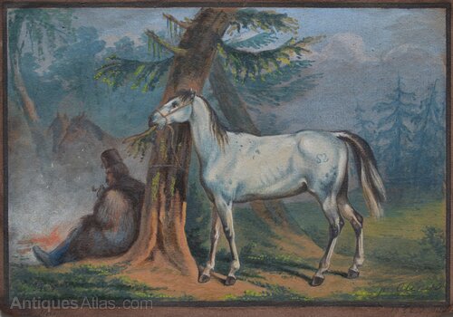 A Cossack Seated and Smoking at the Foot of a Tree Next to his Unsaddled Horse, signed and dated 1822.Gouache with gum arabic on buff paper. Signed with the artists monogram H.V. (lower left) and inscribed p: (pinx or painted) with title A lé nip (lower right). A further inscription just outside the image below the framing line reads le 2(?) Mai (21 or possibly 24? May) – 1822 – S’ Petersburg. Damage has occurred outside the black framing line. Some fragments which include part of the inscription for Petersburg have been retained. The top and bottom left corners are missing. The image however is in good order. A lithograph of the subject (without title) was printed by the artist and will accompany the sale of the painting.