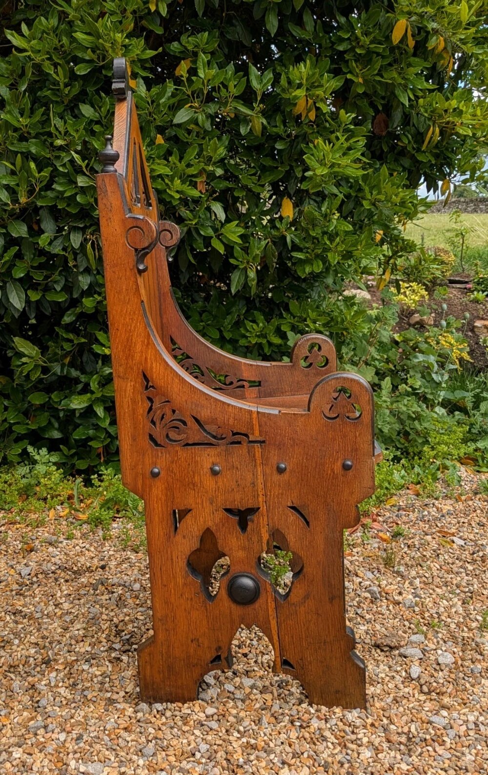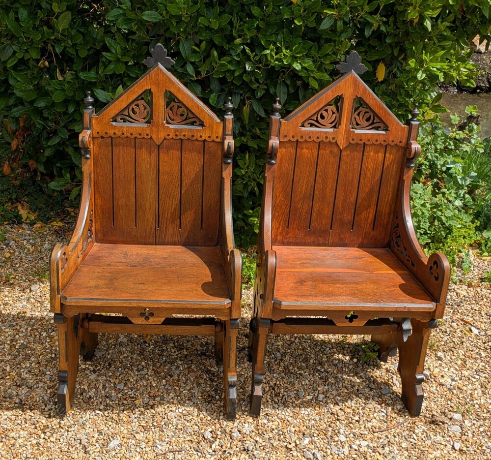 A very smart pair of Victorian oak Gothic chairs in excellent condition with a great style. These are nice golden oak which contrasts well with the ebonised detail throughout the chairs. The chairs are very much in the Pugin, Gothic style with fret cut piercings and bobin buttons and finials. The chairs are heavy and solid in their construction and are in nice characterful condition ready for use and display.These measure 103 cms in height by 52 cms wide and 39 cms deep overall.