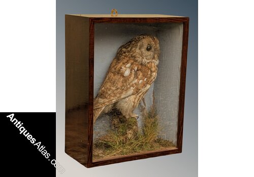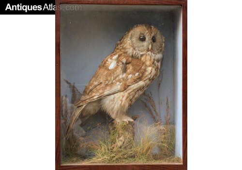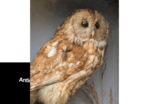 A good cased taxidermy tawny owl circa 1870 full mount adult with head turning to the right, perched atop a small dry tree stump, amidst a natural setting of tall grasses, enclosed within a later mahogany framed single-glass display case. Excellent condition. The case measures 37cm by 47cm by 18cm deep.UK insured packing and delivery is £20.