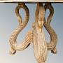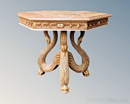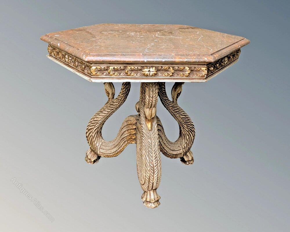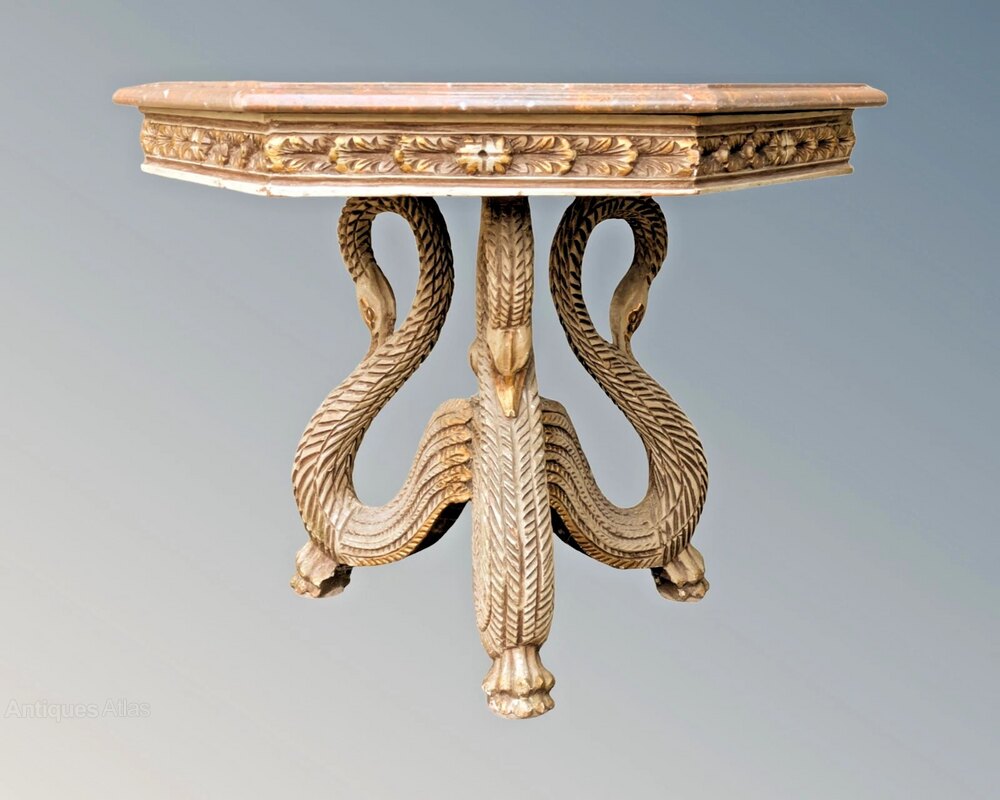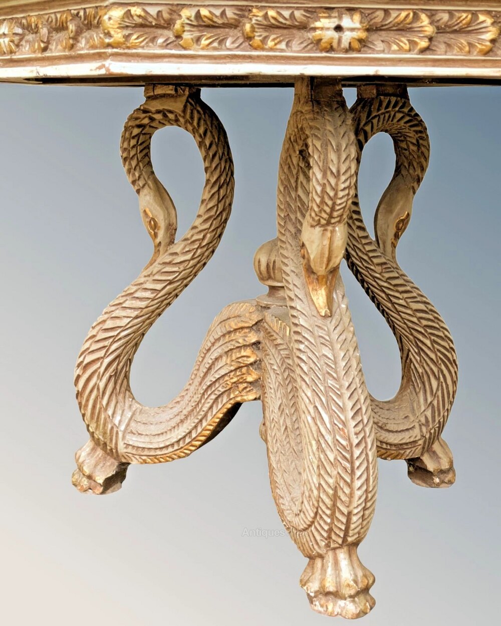 This is a very attractive early 20th century French table in super order dating from around 1920.The hand carved hardwood base is in the form of three fine swans beautifully hand painted in a warm French grey with attractive gilt highlights.