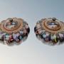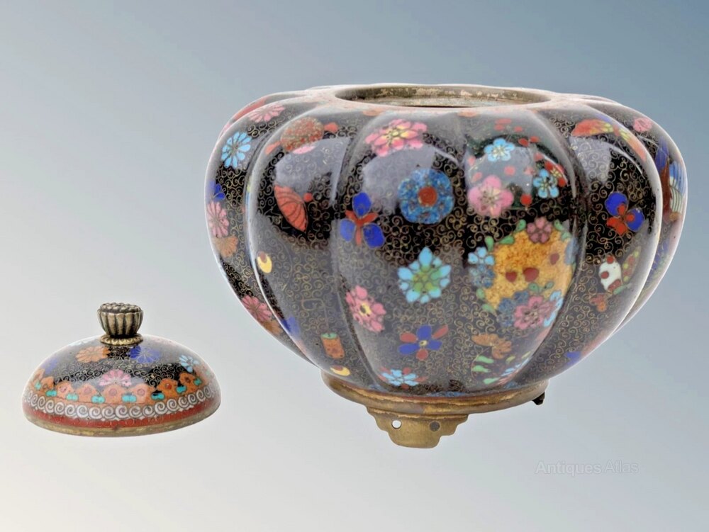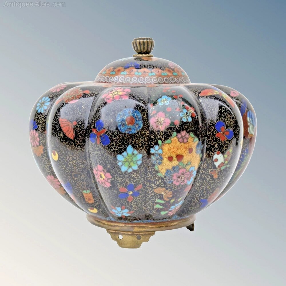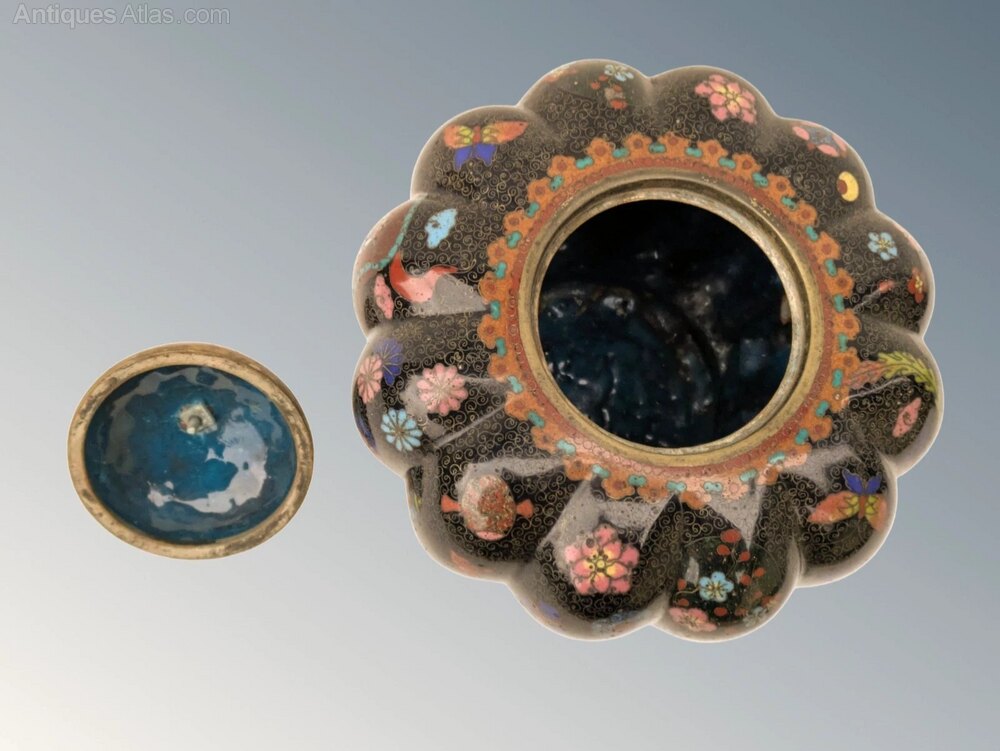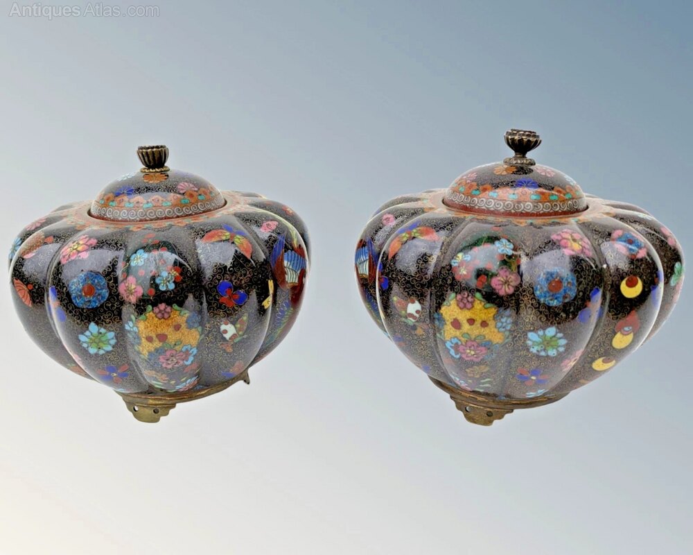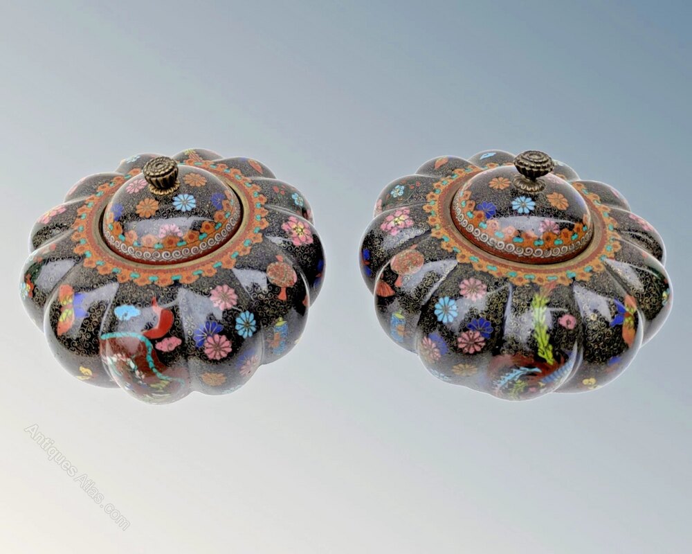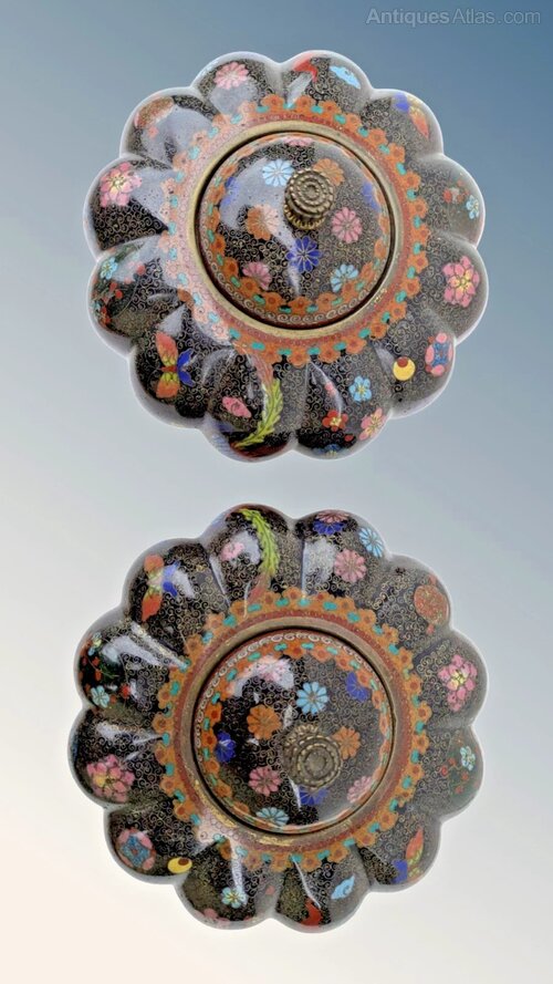This is a good pair of Japanese meiji lidded jars and covers in super condition dating from around 1890. The jars have a great shape of squat fluted form with domed lids and are beautifully decorated with colourful, intricate floral, bird and insect wirework on a black enamel ground. These are standing on three pierced shaped feet and are in excellent condition with original finial to each.The jars are 12 cms high by 13 cms in diameter.