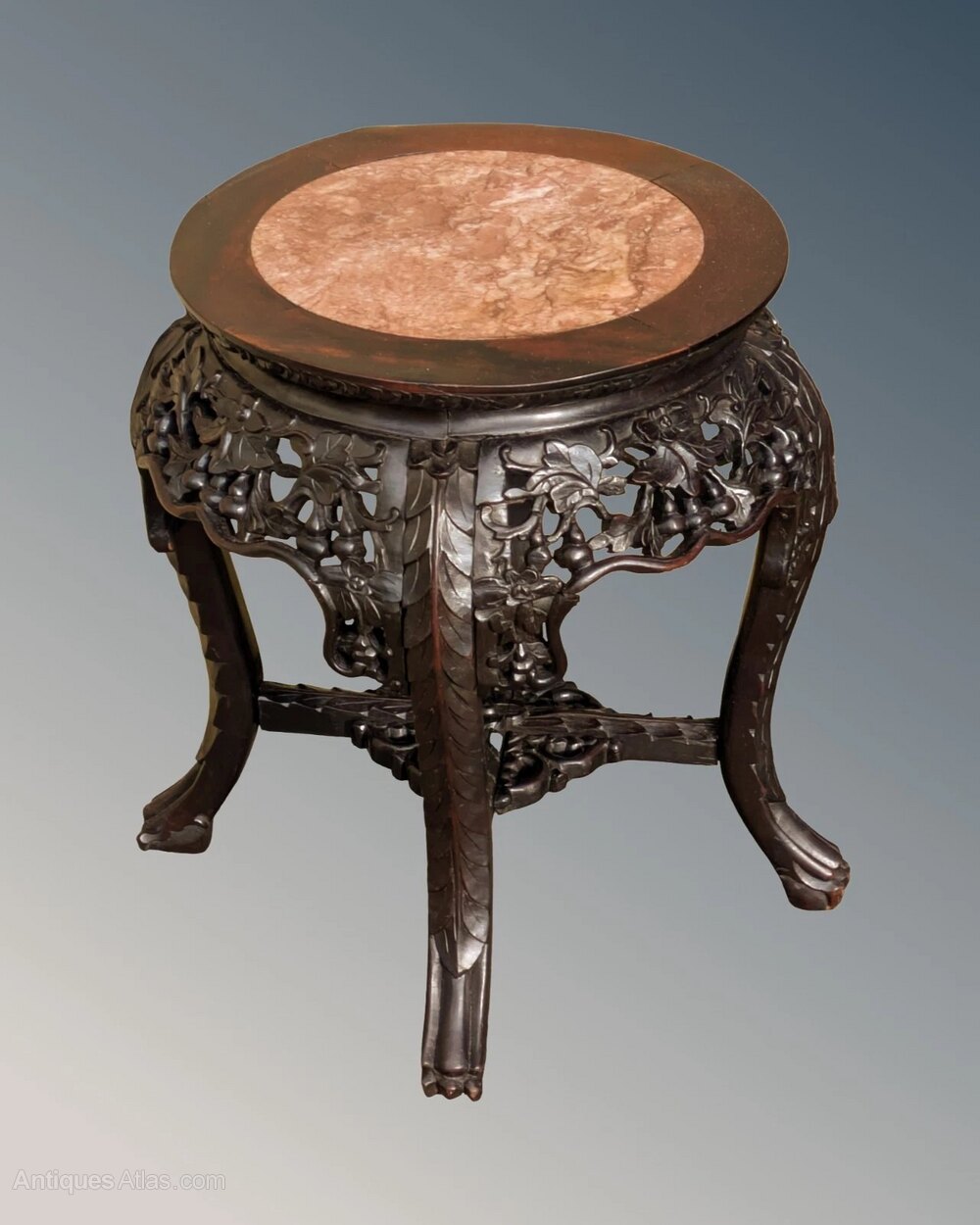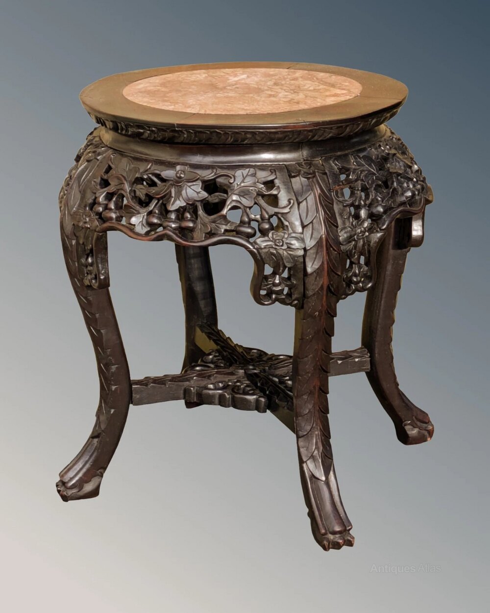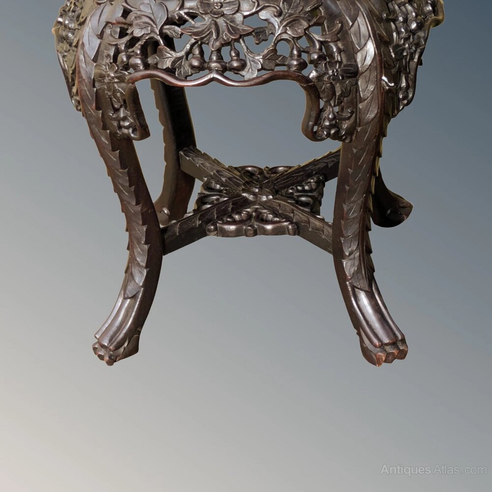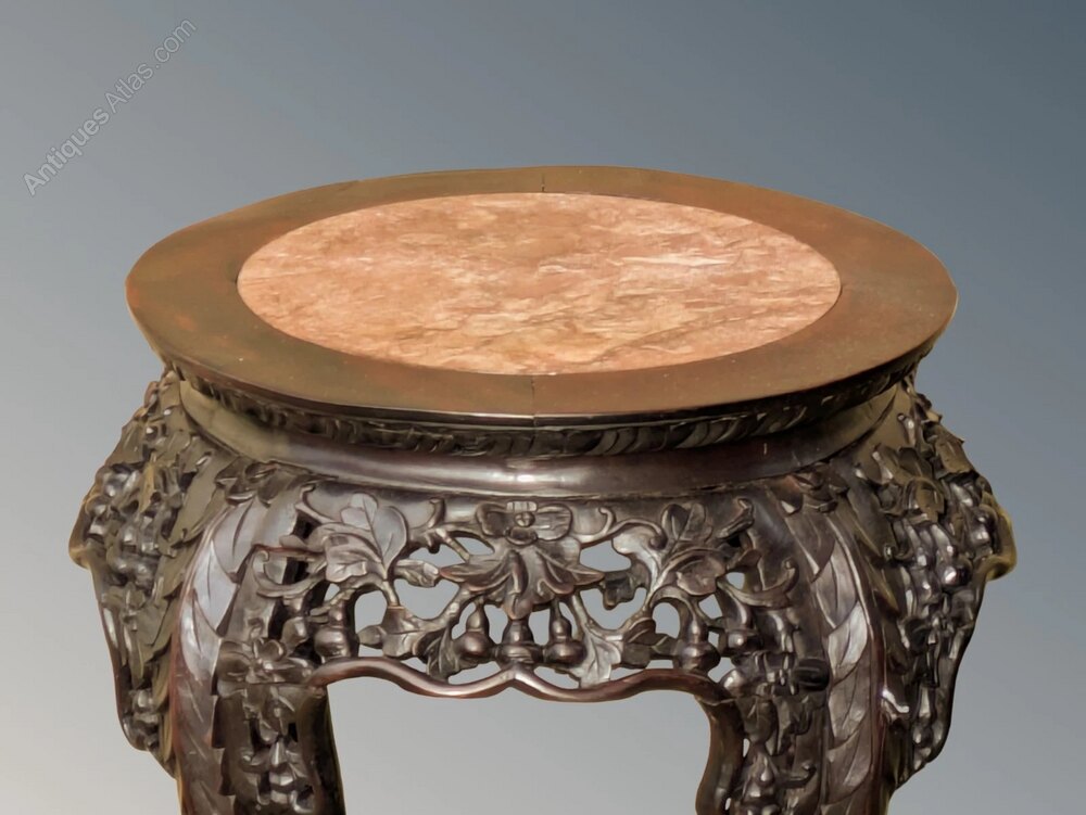 This is a handsome good quality Chinese table or stand in super condition dating from around 1860.The solid hand carved rosewood frame has a great shape with sturdy understretchers and an inset rouge marble top.