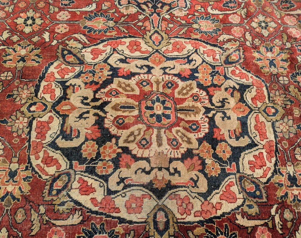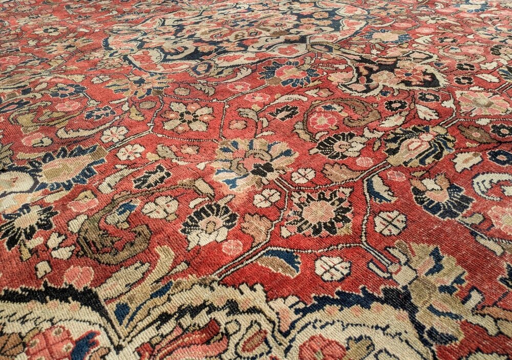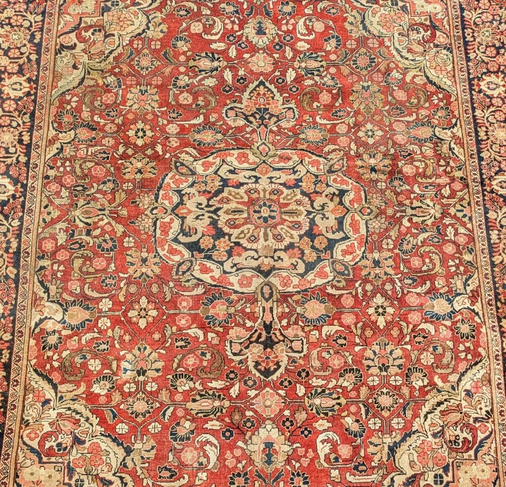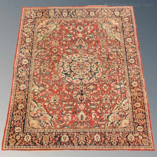 This is a large Mahal carpet with a really attractive design and great country house look dating from around 1900.The room size carpet has a raspberry field centred by a large floral medallion framed by spandrels and indigo borders of palmettes and flowers, flanked by guard stripes. The Mahal has a great colour combination and good detail to the design which incorporates multiple flower motifs with acanthus leaf scrolls a large central medallion.