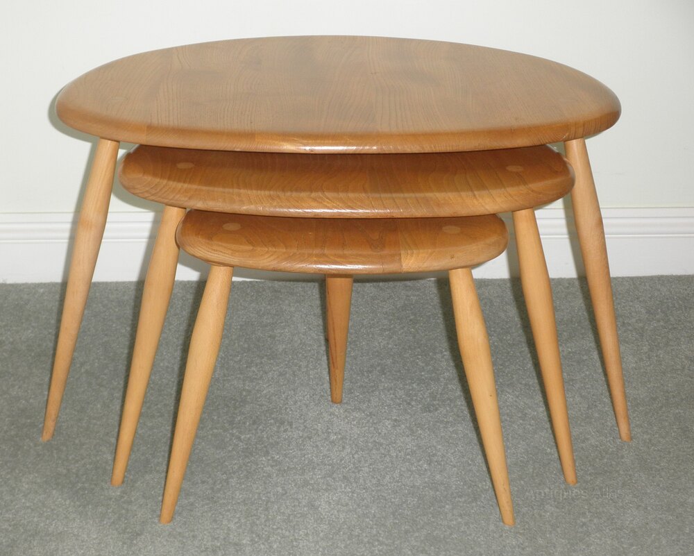 Nest of Ercol ‘Pebble’ Coffee TablesA beautiful set of Ercol’s classic three ‘Pebble’ coffee tables in the very desirable light elm finish which are in totally un-restored condition that still look extremely attractive even though there is a small area showing minor signs of use near the front edge of the top table – hence the price – please see the feint mark on photos